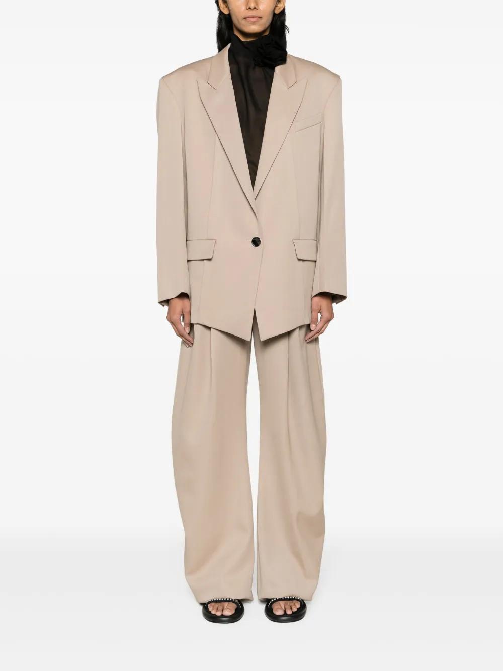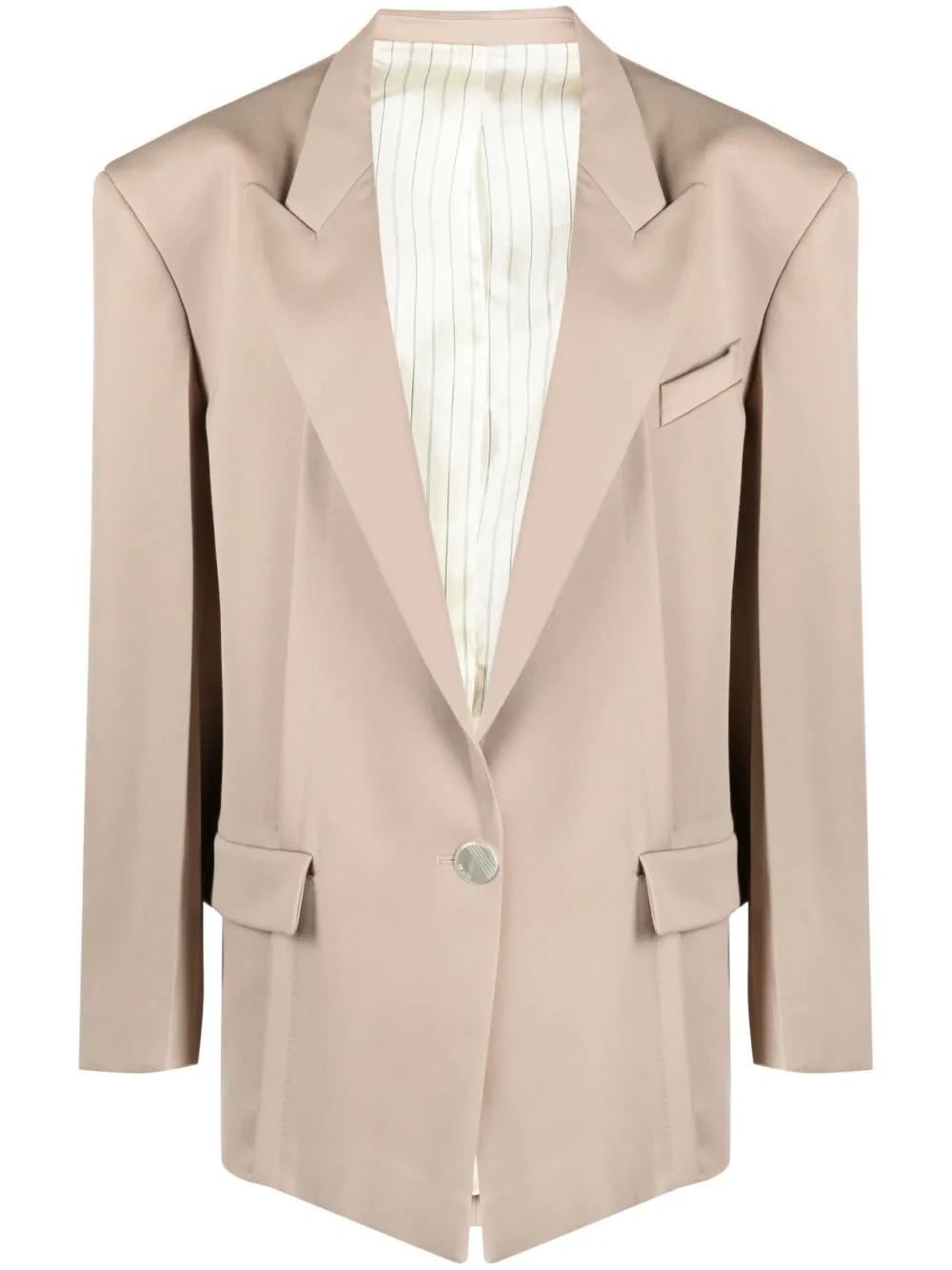 beige virgin wool shoulder pads wide peak lapels long sleeves chest welt pocket front button fastening two side flap pockets high-low hem
