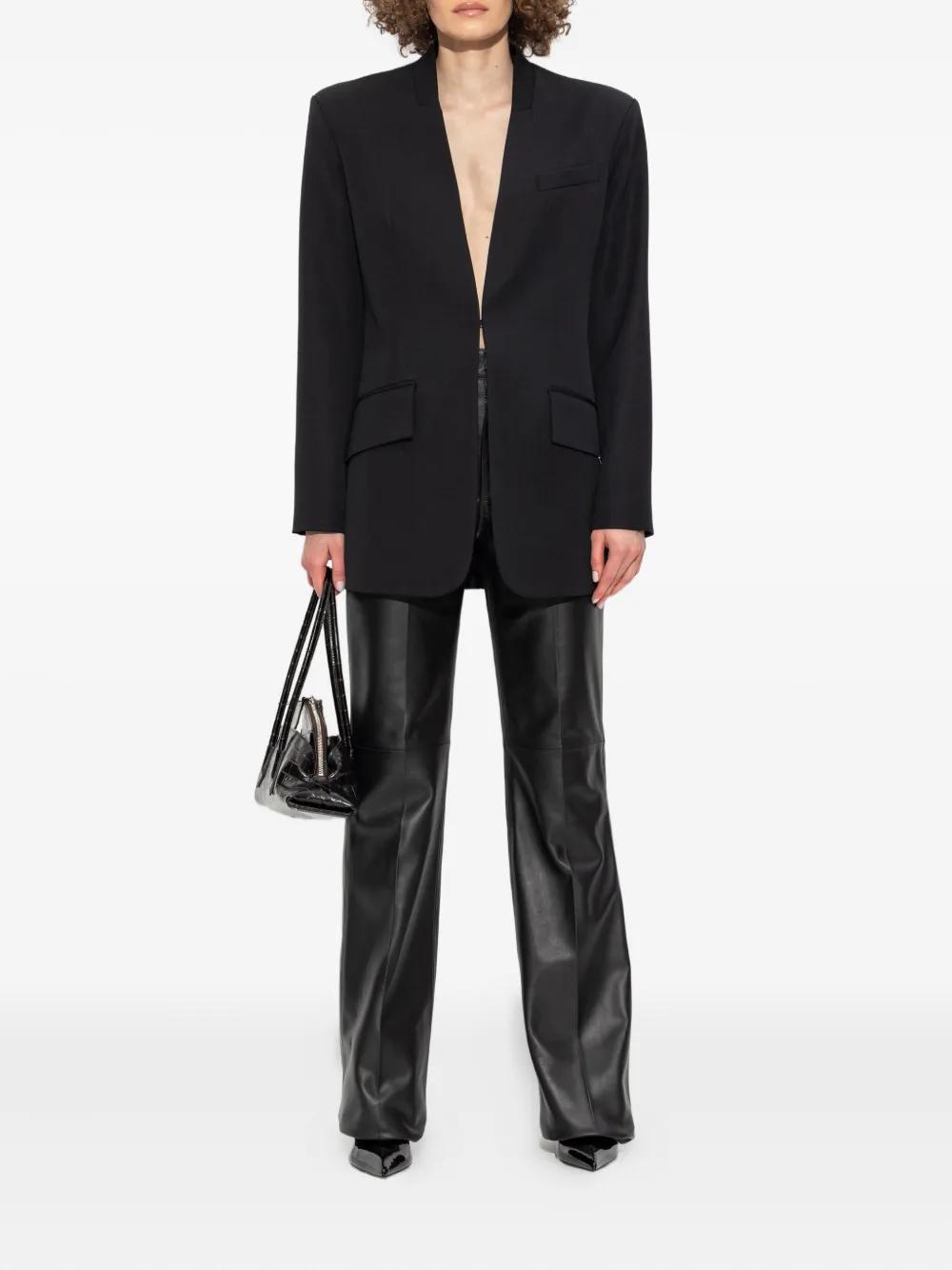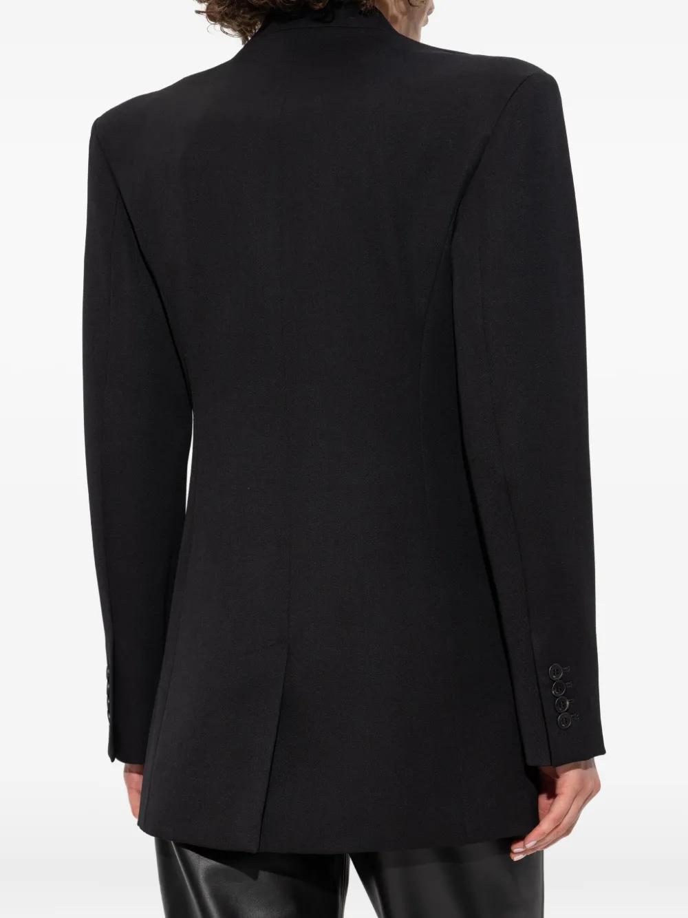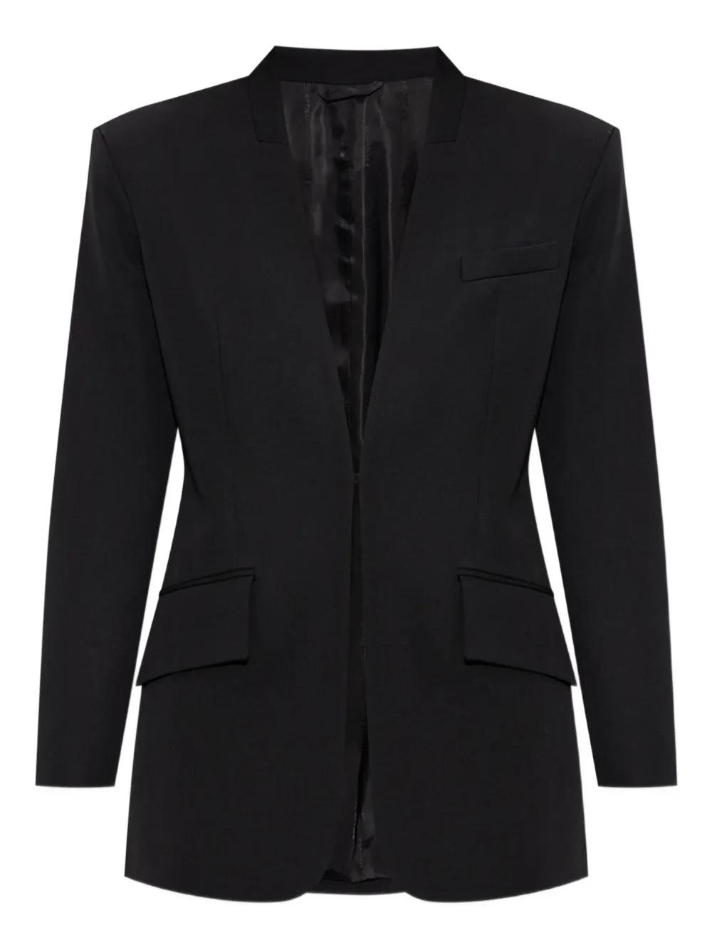 black padded shoulders V-neck flap pockets long sleeves button fastening