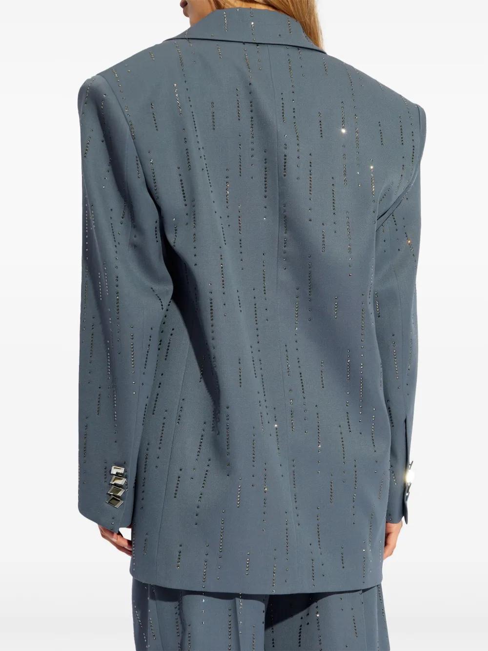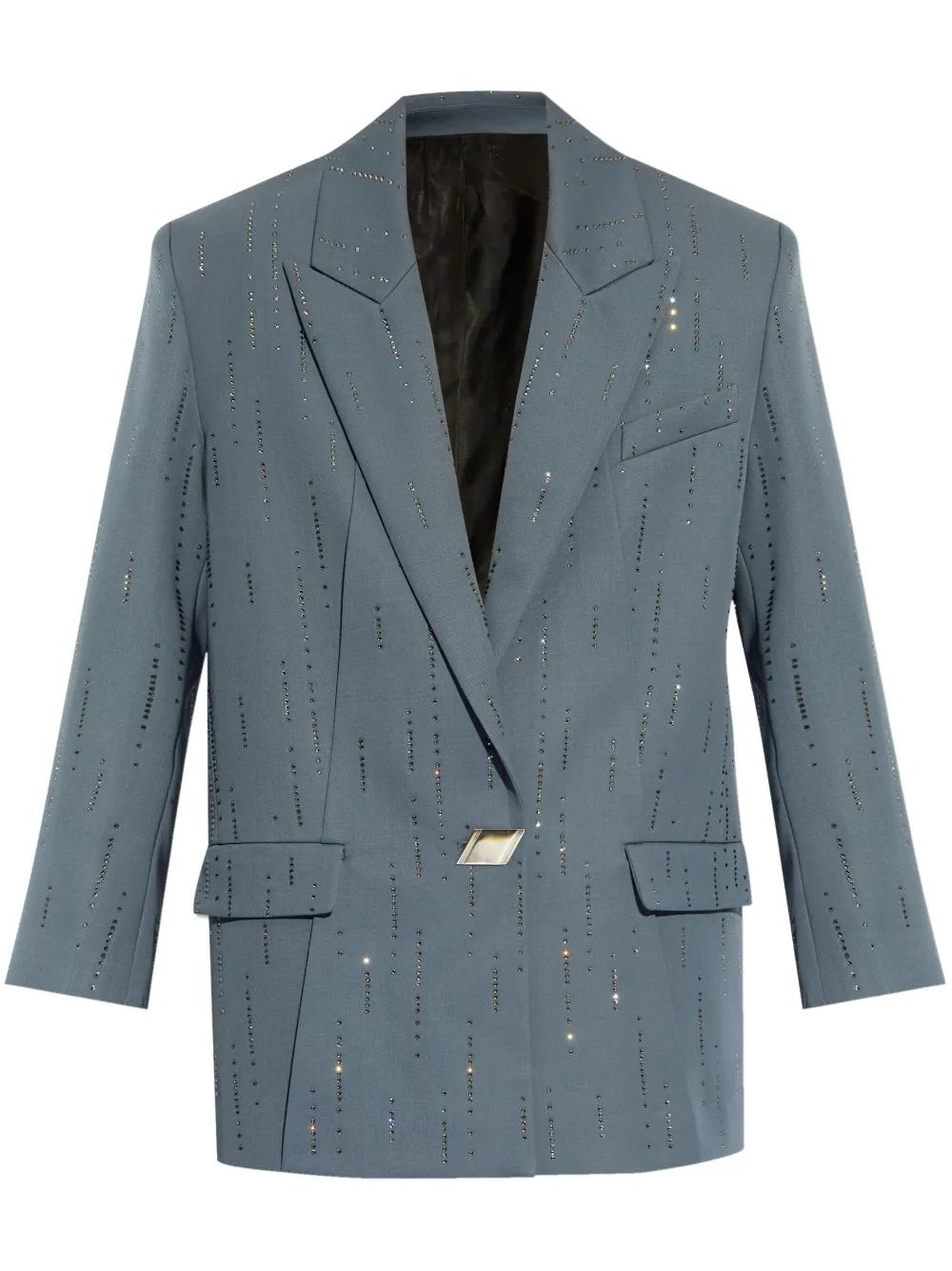 navy blue wool tailored design rhinestone embellishment peak lapels front button fastening shoulder pads long sleeves buttoned cuffs chest welt pocket two front flap pockets straight hem satin lining