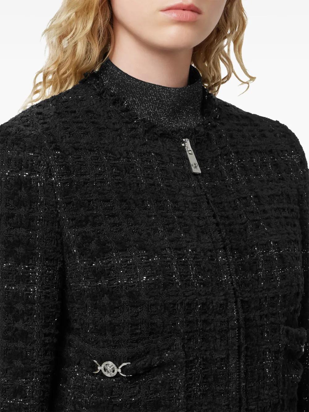 black tweed effect zip fastening two front pockets round neck frayed hem