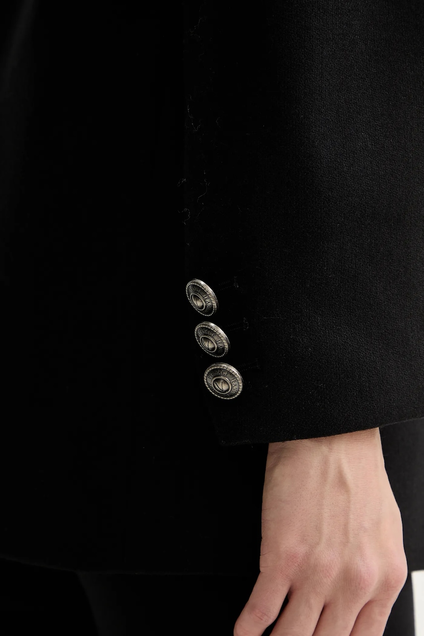 - Prosty, nie blokujący ruchów fason. - Model na podszewce. - W ramiona wszyte poduszki. - Zapięcie na klamry ze szpilką, które umożliwiają indywidualne dopasowanie. - Model z kieszeniami, ozdobionymi patkami. - Długość rękawa: 62 cm. - Długość: 75 cm. - Szerokość pod pachami: 51 cm. - Wymiary podane dla rozmiaru: 38.