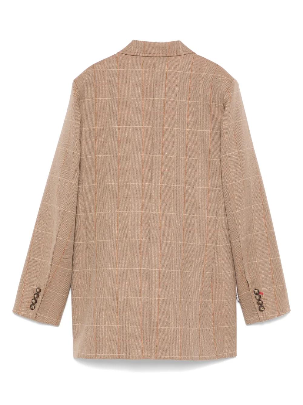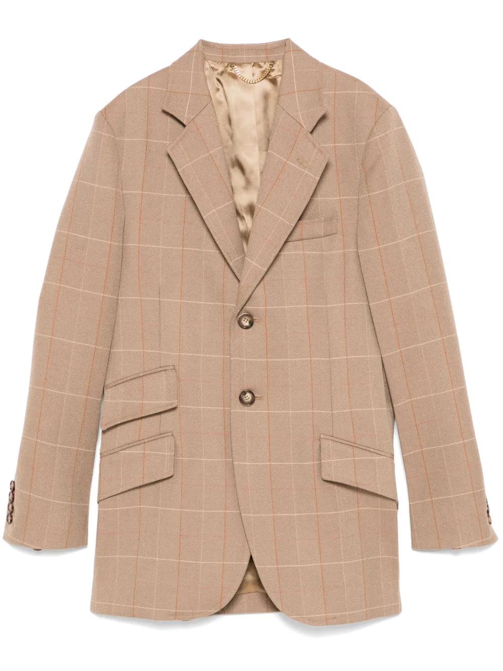 camel brown/beige/orange virgin wool tweed check pattern front button fastening herringbone pattern notched lapels shoulder pads long sleeves buttoned cuffs chest welt pocket dart detailing three front flap pockets American rear vent full lining curved hem