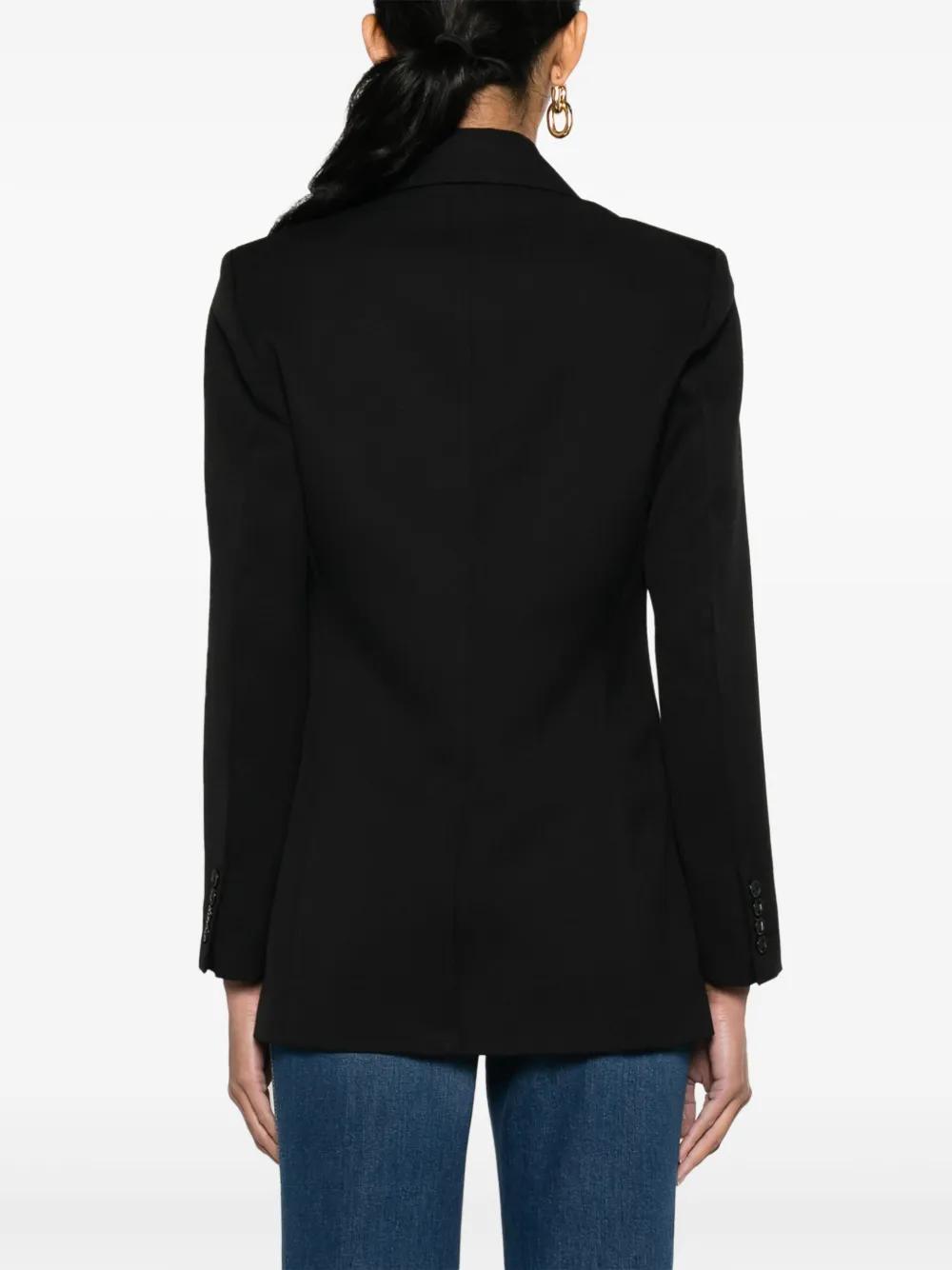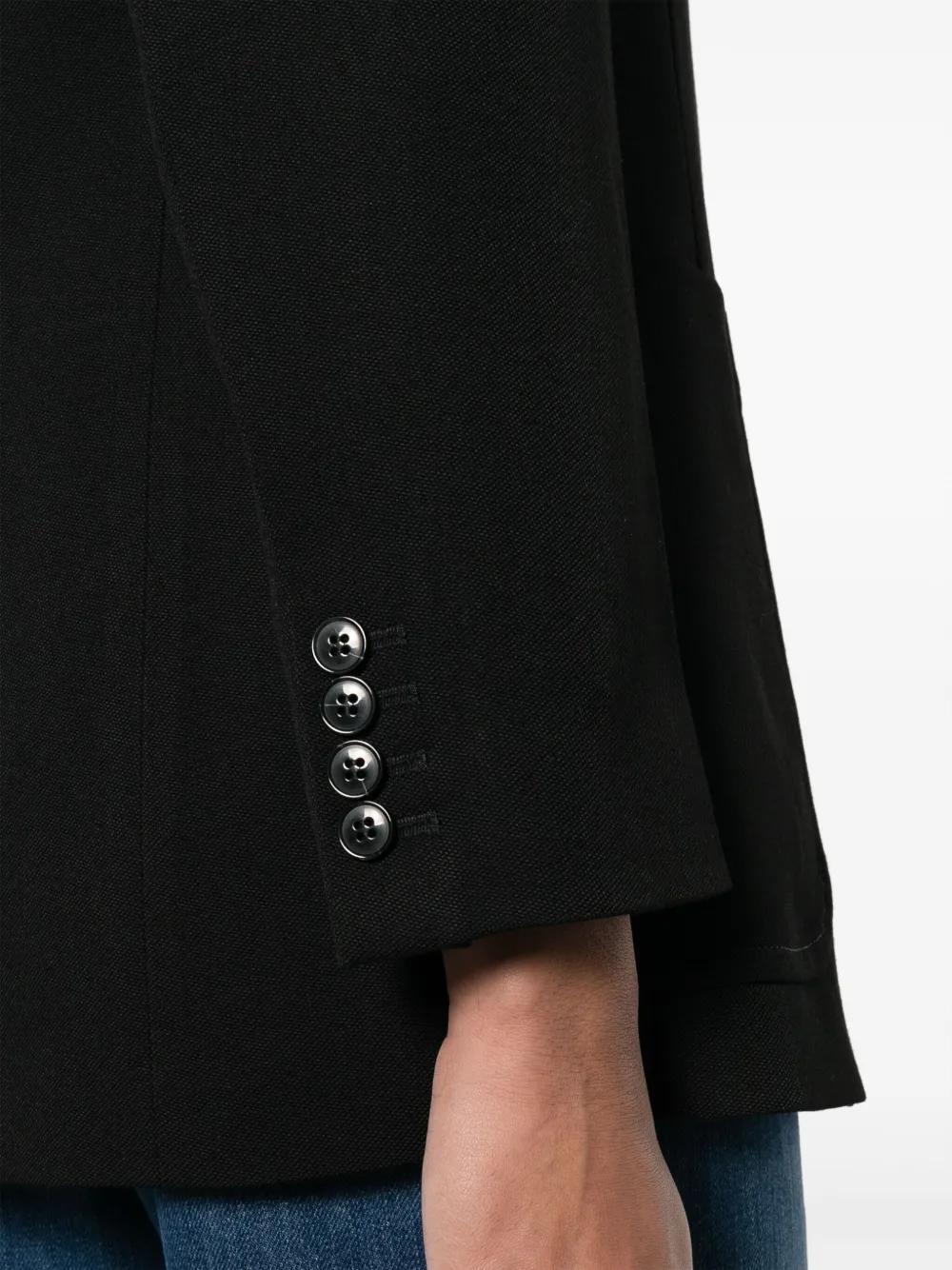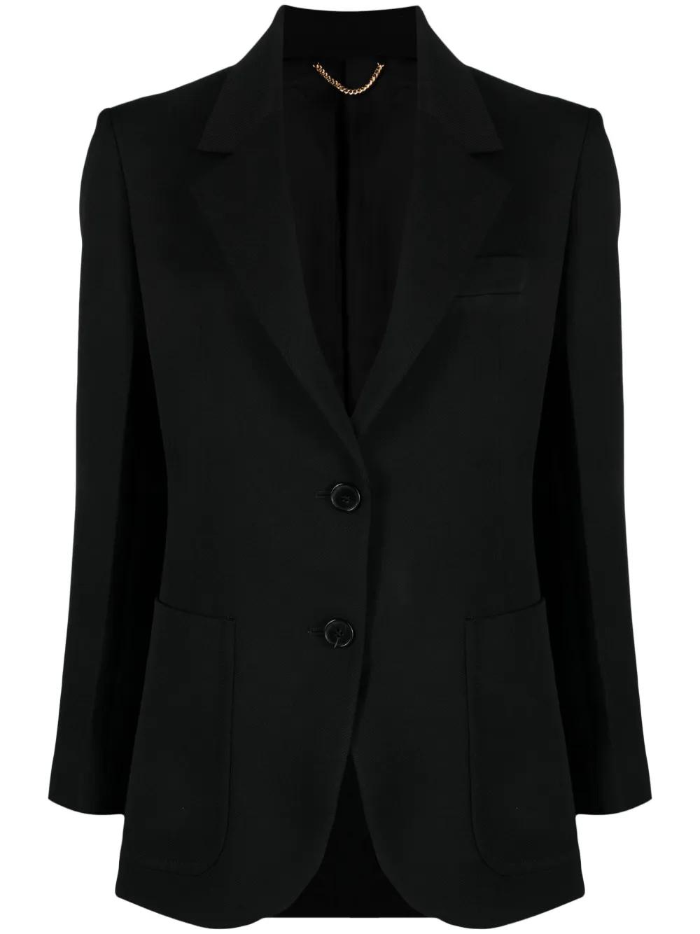 black gabardine weave notched lapels front button fastening long sleeves buttoned cuffs chest welt pocket two front patch pockets American rear vent straight hem satin lining