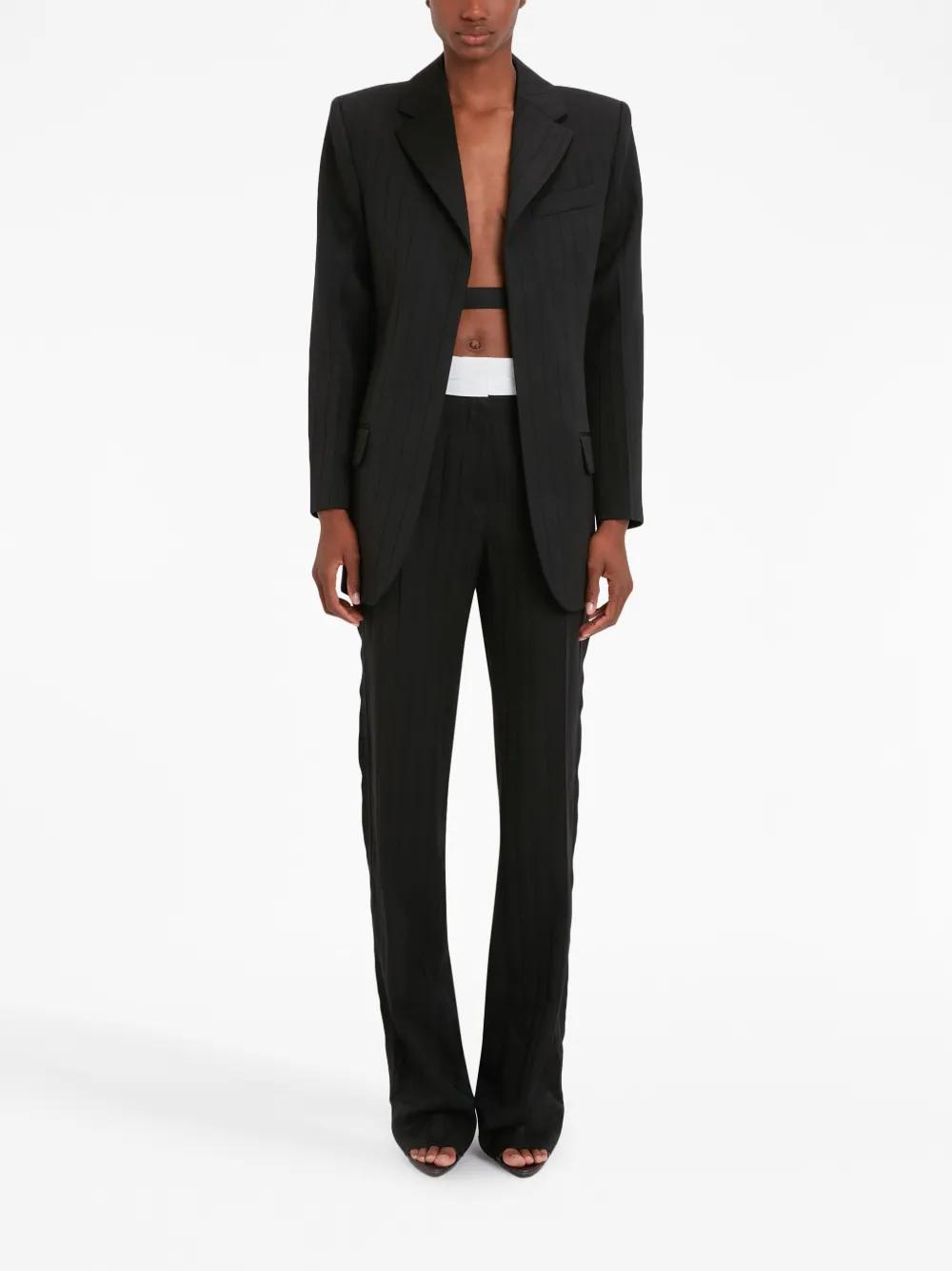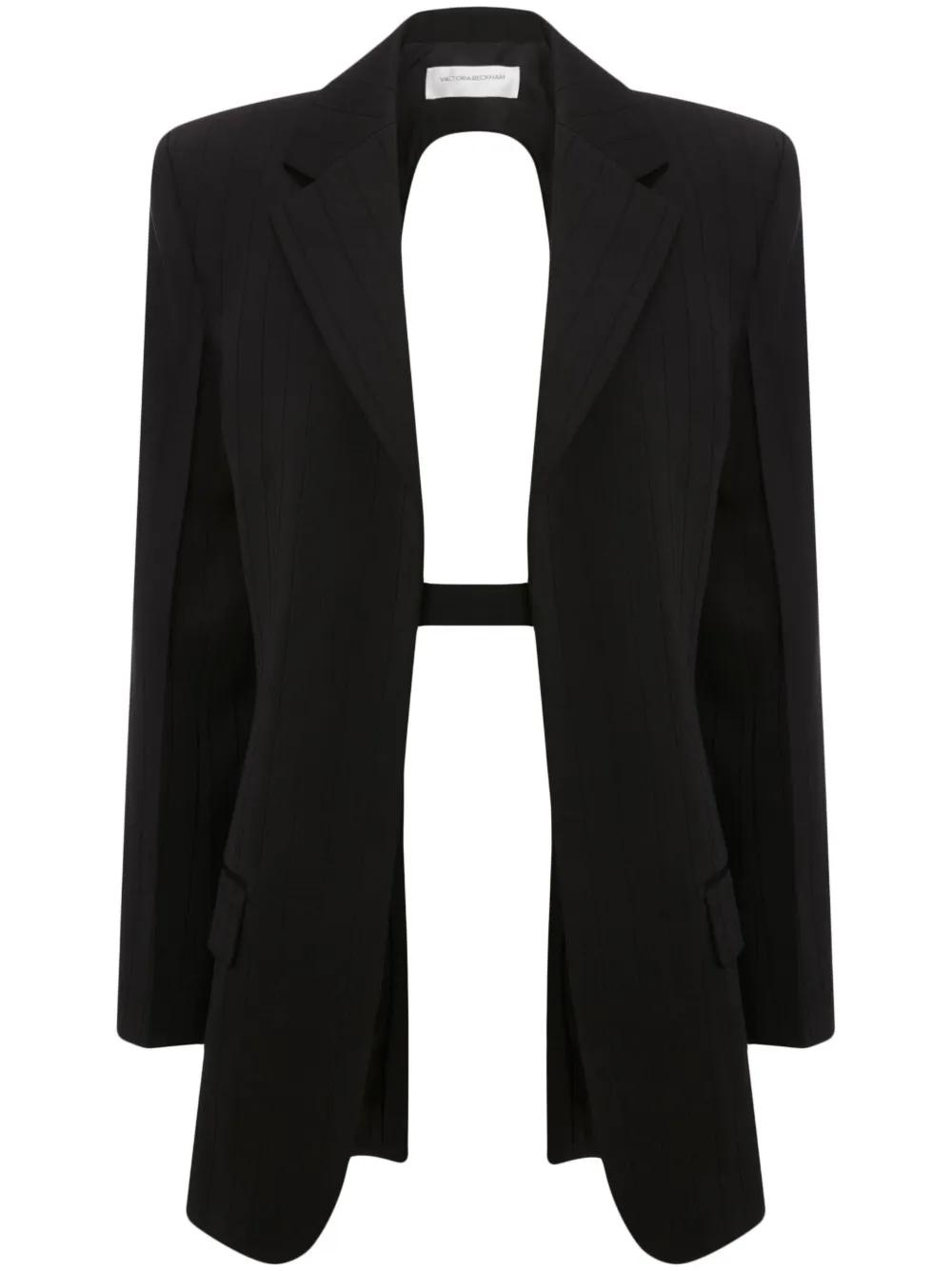 black wool open back notched lapels front button fastening long sleeves chest welt pocket two side flap pockets