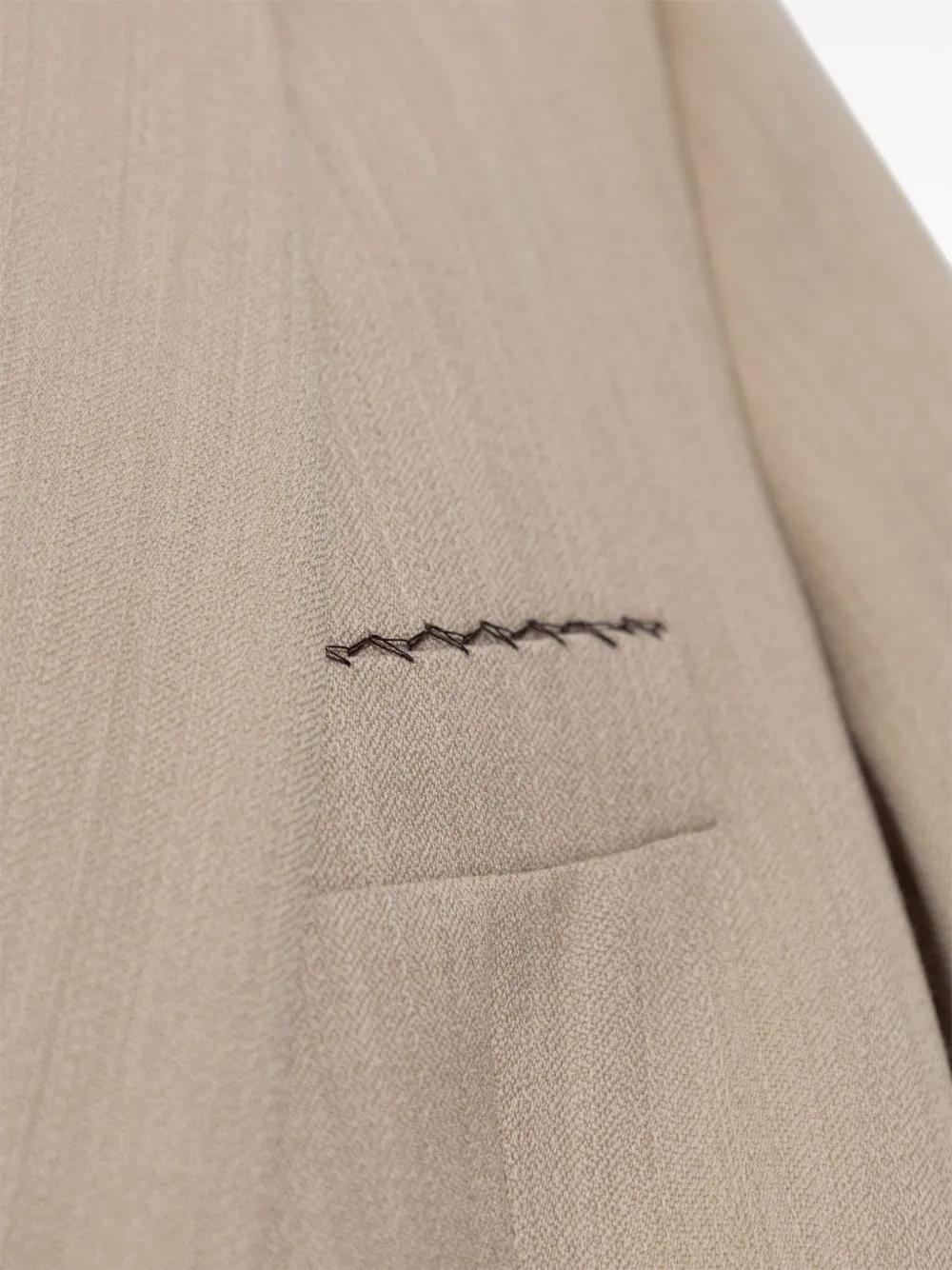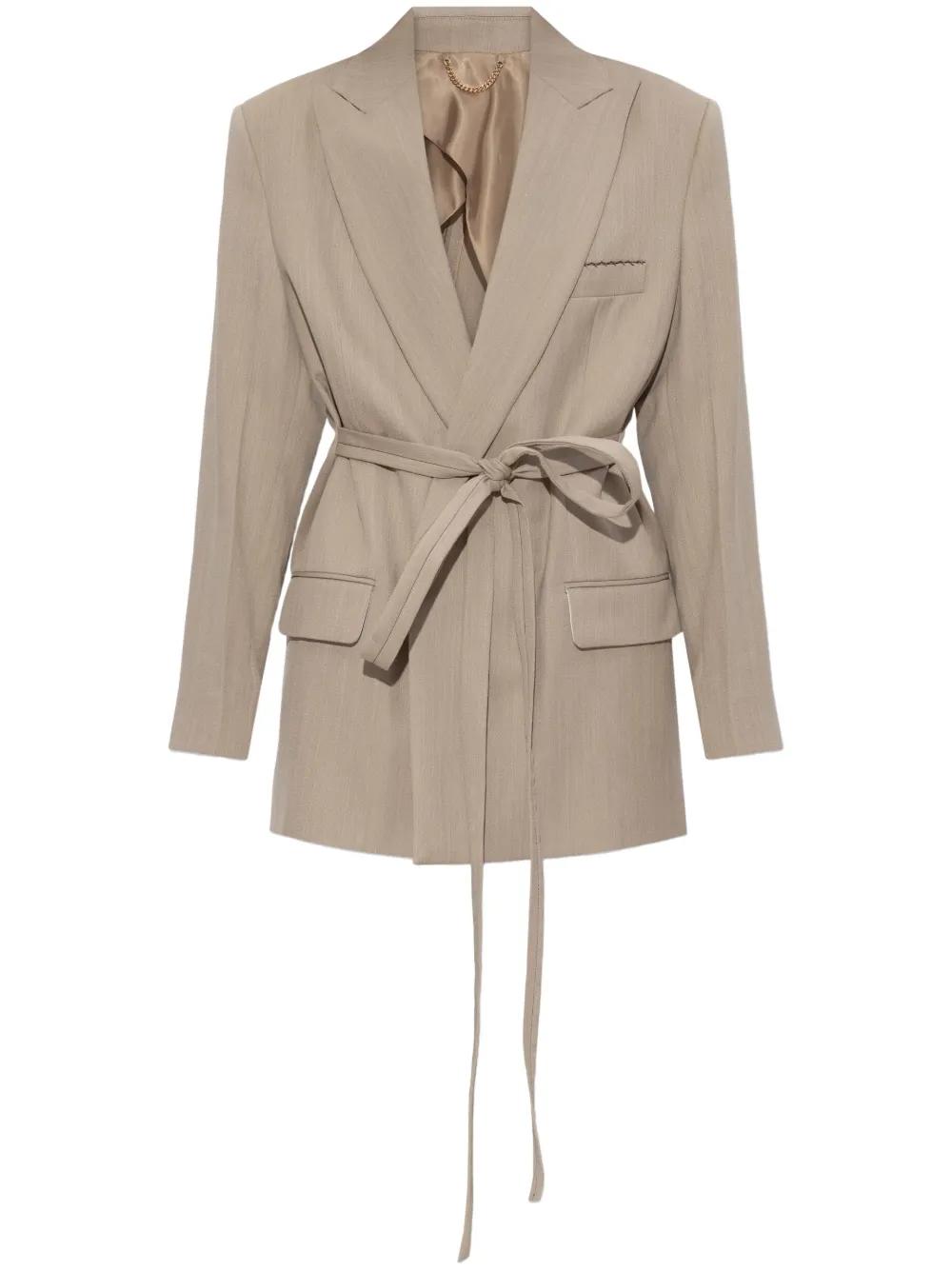beige tied waist chest welt pocket two front flap pockets peak lapels