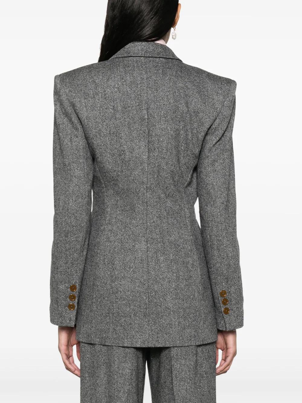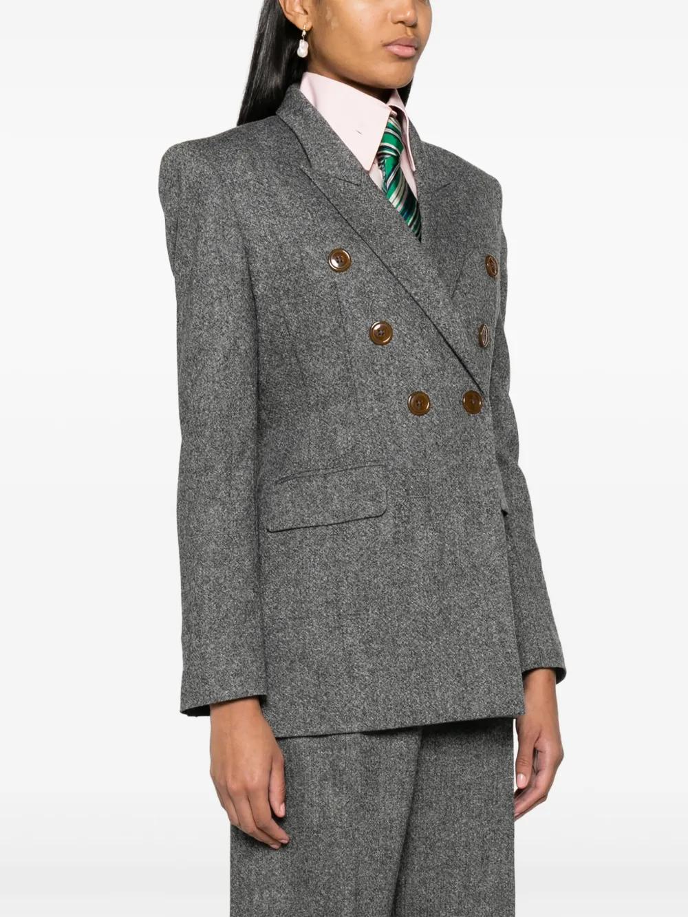dark grey virgin wool-cashmere blend notched lapels double-breasted button fastening long sleeves buttoned cuffs chest welt pocket two front flap pockets straight hem
