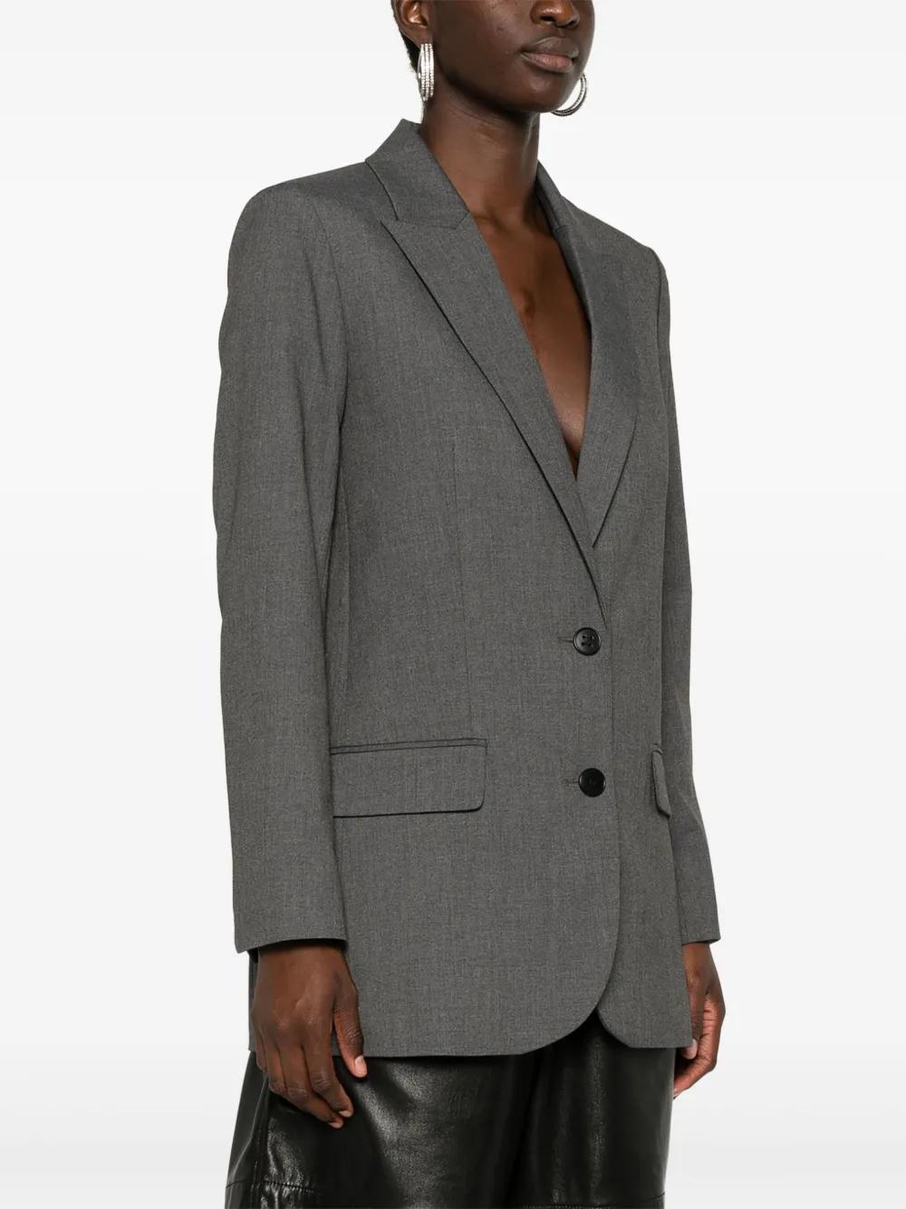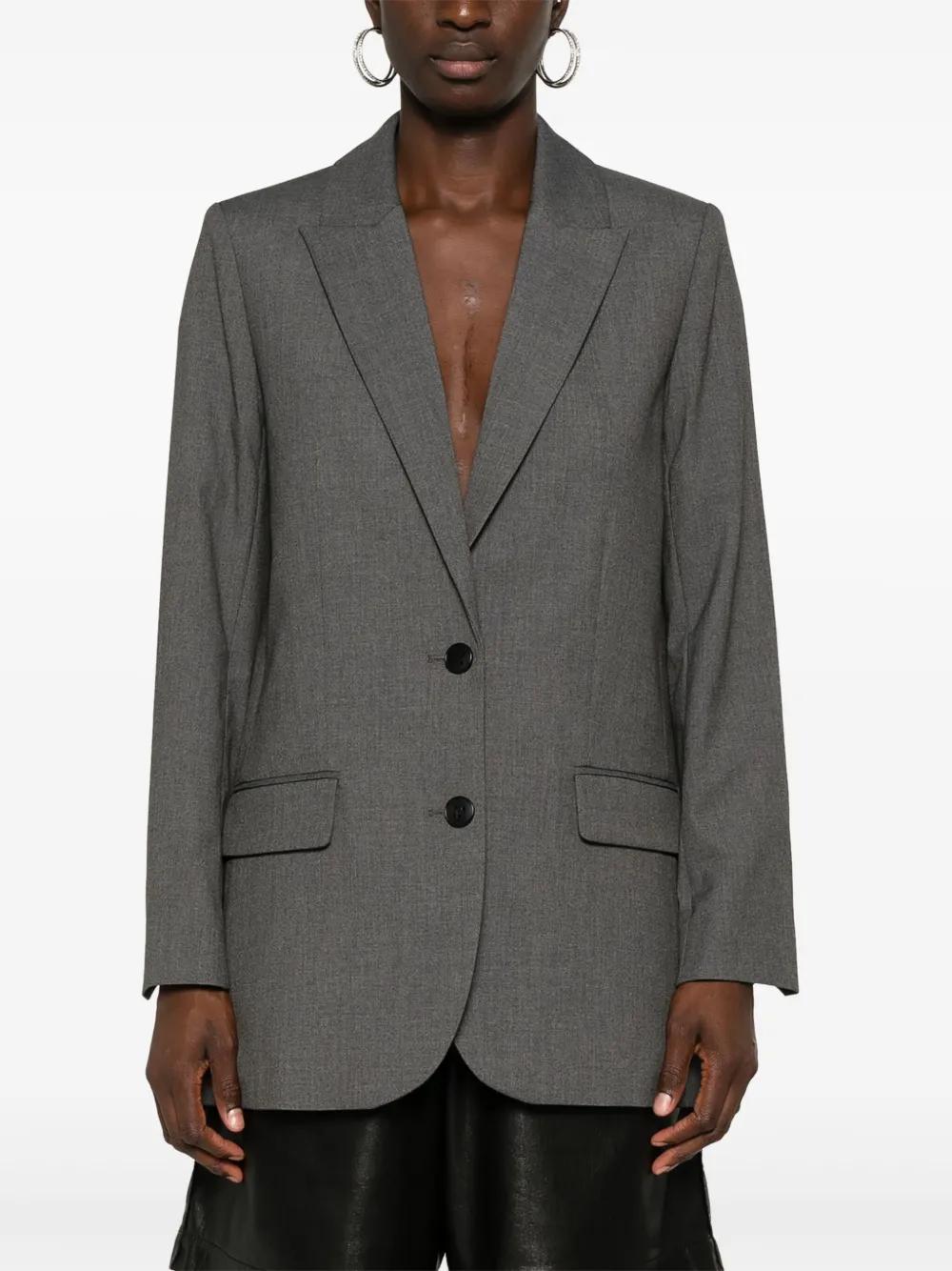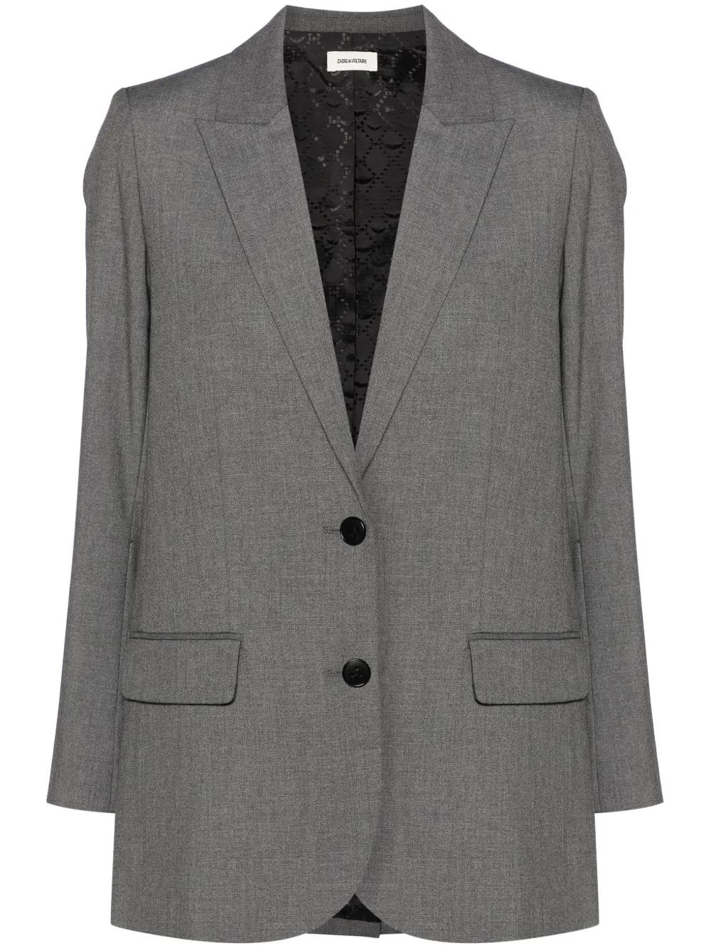 anthracite grey textured finish peak lapels shoulder pads long sleeves split cuffs two side flap pockets rhinestone-slogan to the rear logo-jacquard lining front button fastening
