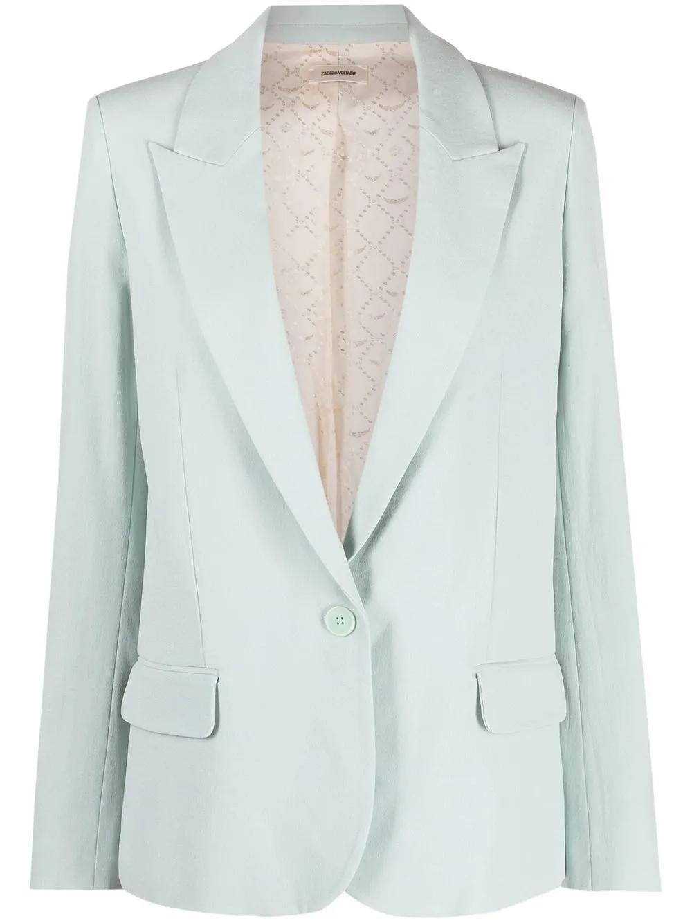 pastel blue peak lapels front button fastening long sleeves two front flap pockets