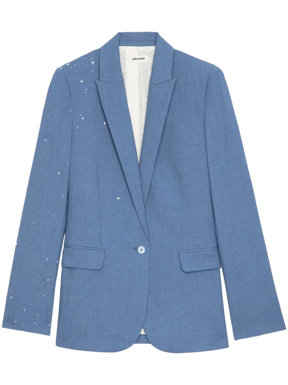 ocean blue front button fastening two side flap pockets buttoned-cuff sleeves central rear vent