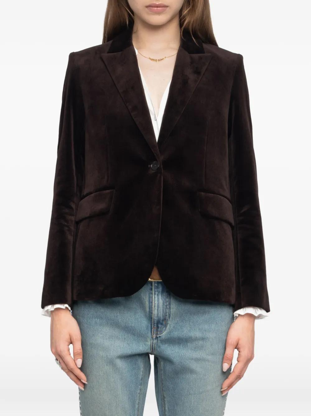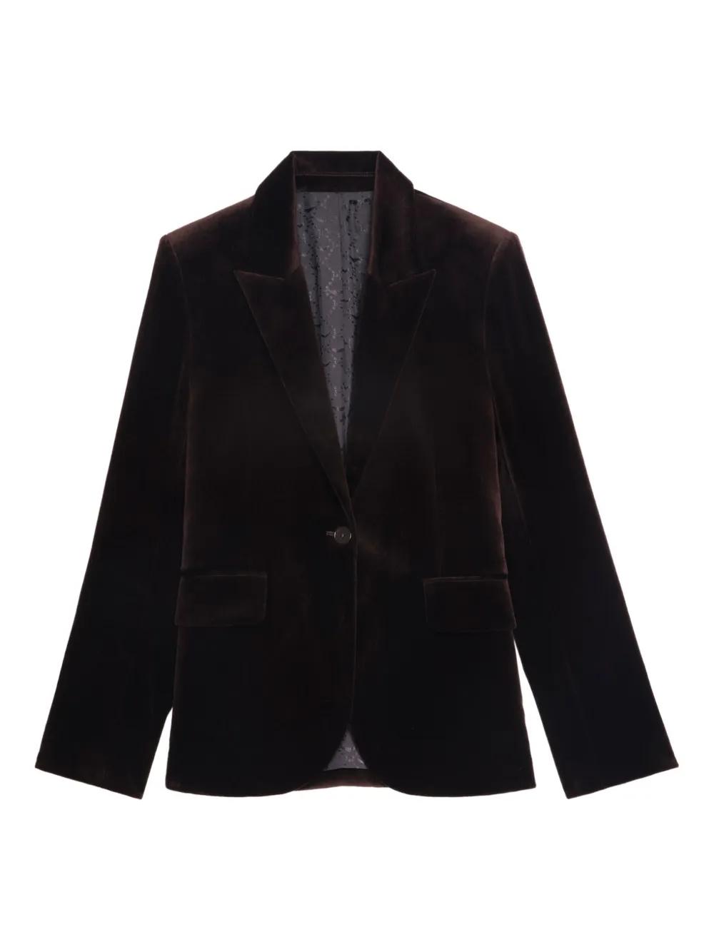 dark brown velvet texture single button fastening notched lapel welt pockets curved hem