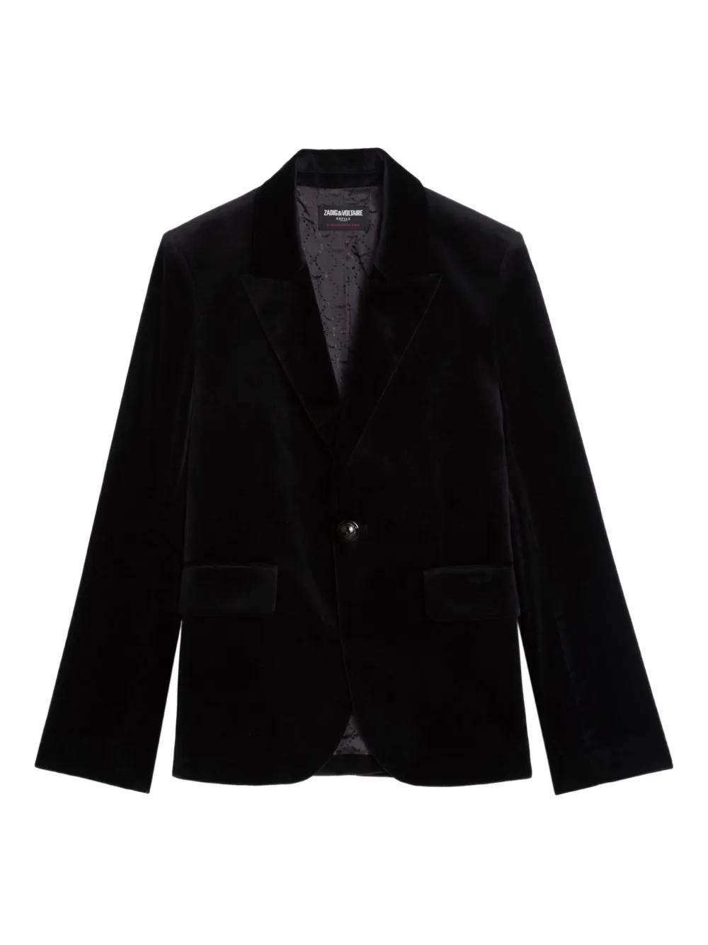 black velvet texture button fastening peak lapels front flap pockets long sleeves