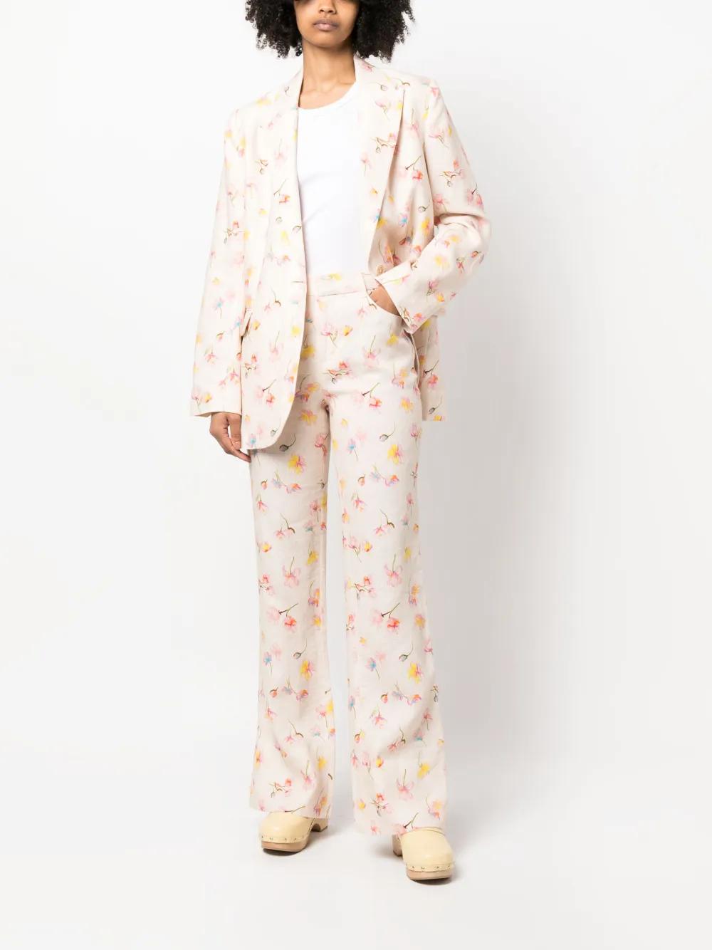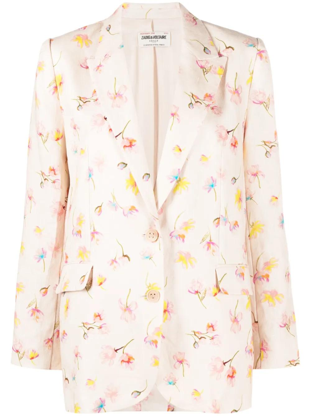 light beige linen all-over floral print peak lapels front button fastening long sleeves two front flap pockets