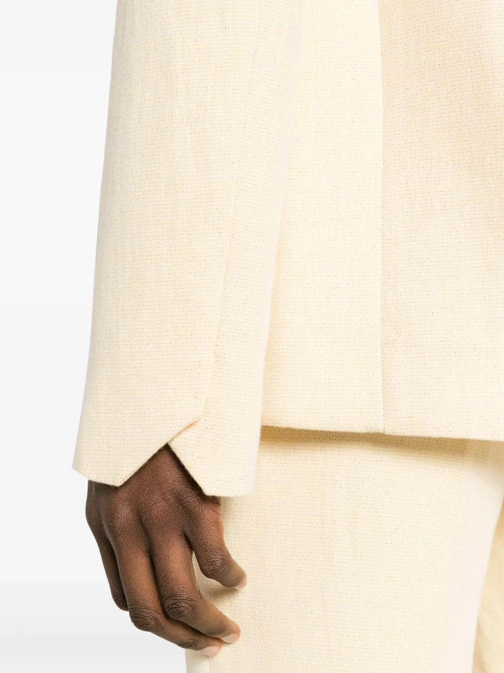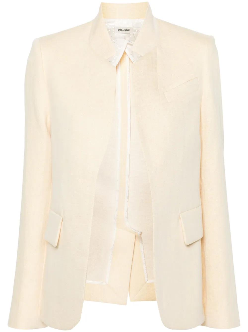 yellow cotton blend lurex detailing stand-up collar open front shoulder pads long sleeves split cuffs chest welt pocket two front flap pockets American rear vent straight hem partial lining