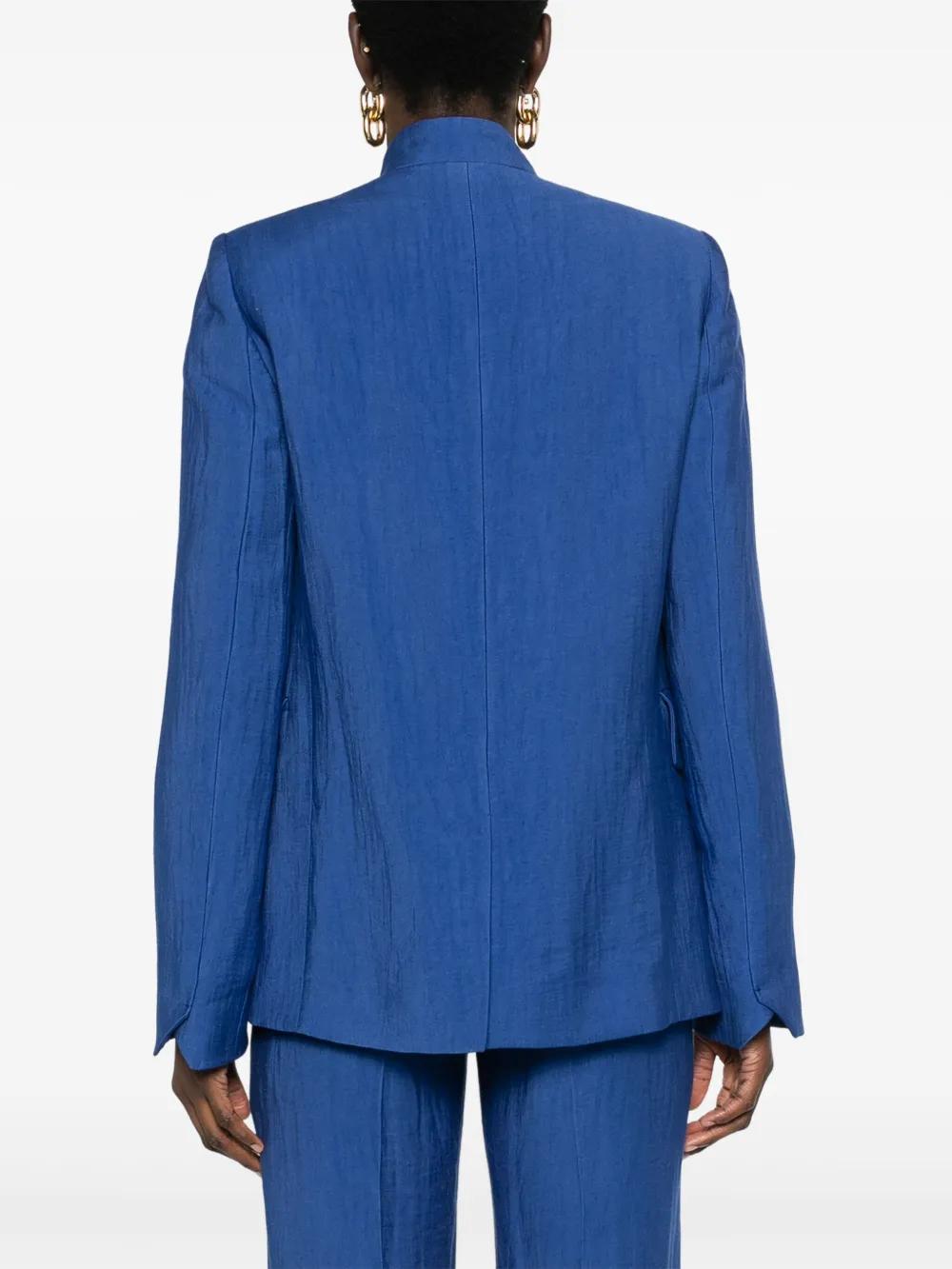 blue sapphire twill weave notched lapels open front shoulder pads long sleeves split cuffs chest welt pocket two front flap pockets American rear vent straight hem partial lining
