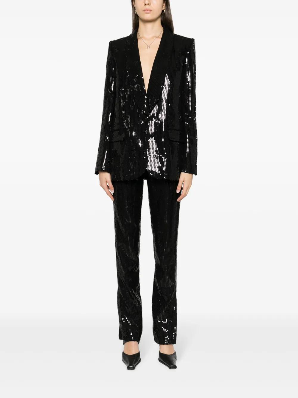 black stretch-design sequin design pinched shoulders shawl lapels front button fastening long sleeves straight hem logo-print lining