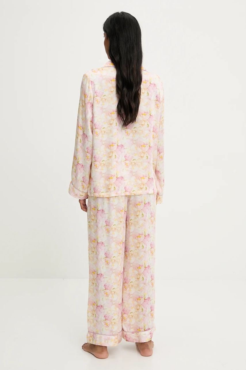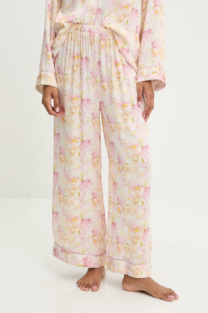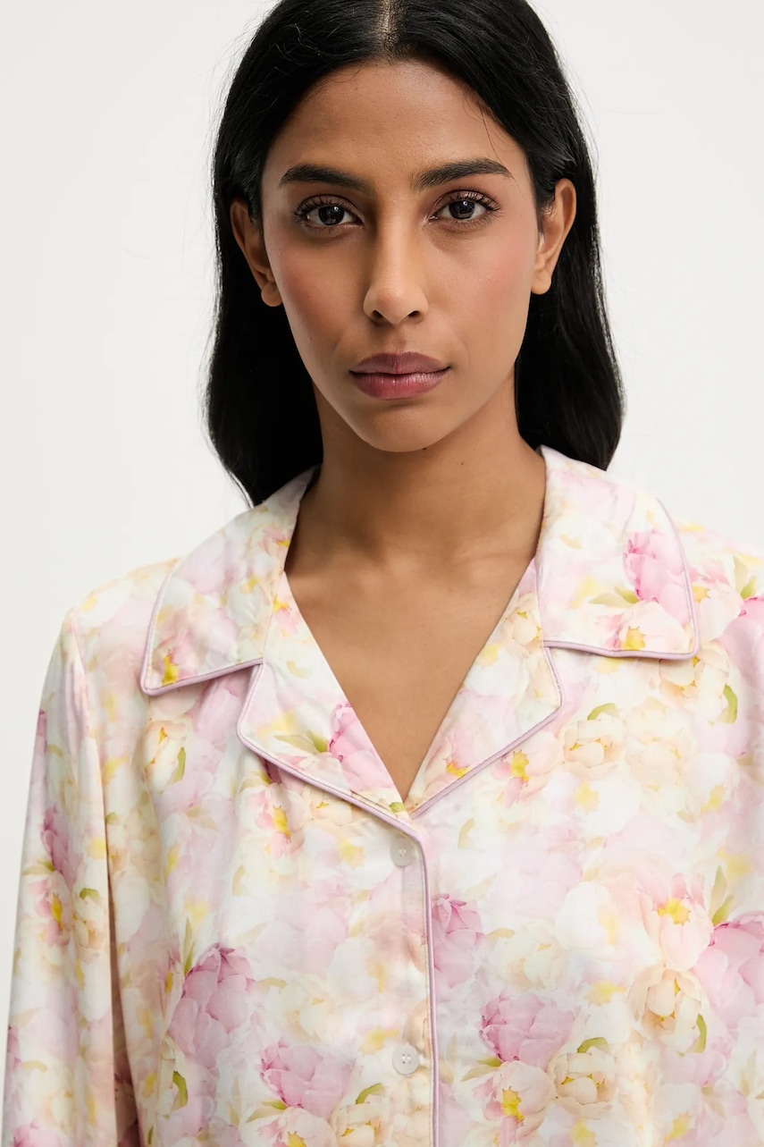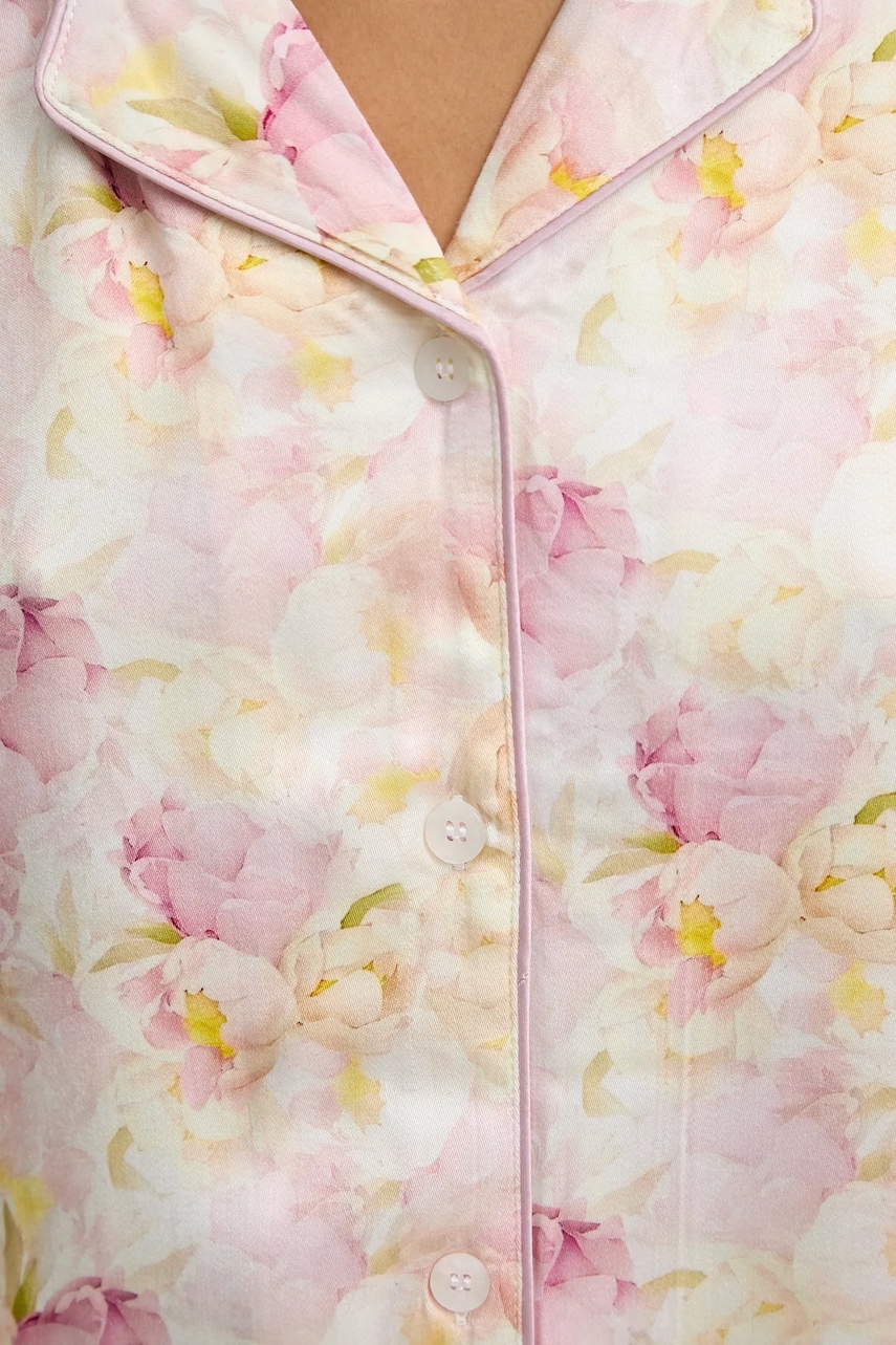 - W skład piżamy wchodzi koszula i spodnie. - Luźny fason. - Długi rękaw. - Zapięcie na guziki. - Elastyczna listwa w pasie. - Szeroka nogawka.
