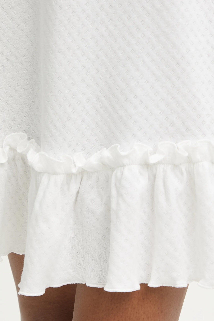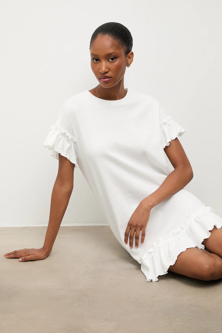 - Luźny krój zapewniający pełną swobodę ruchów. - Klasyczny, okrągły dekolt. - Krój rękawa z obniżoną linią ramion nie ogranicza mobilności. - Efektowne falbany. - Długość: 86 cm. - Szerokość pod pachami: 54 cm. - Wymiary podane dla rozmiaru: S.