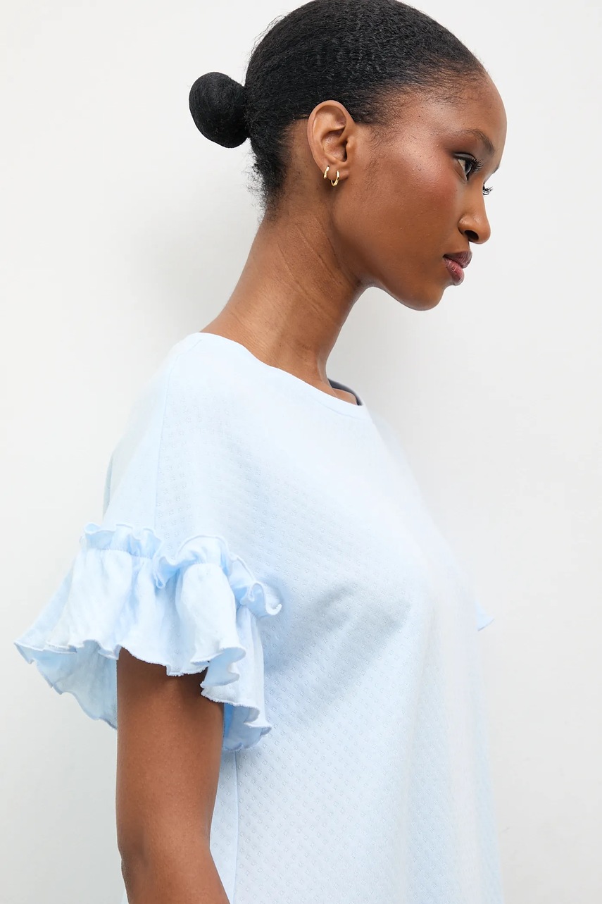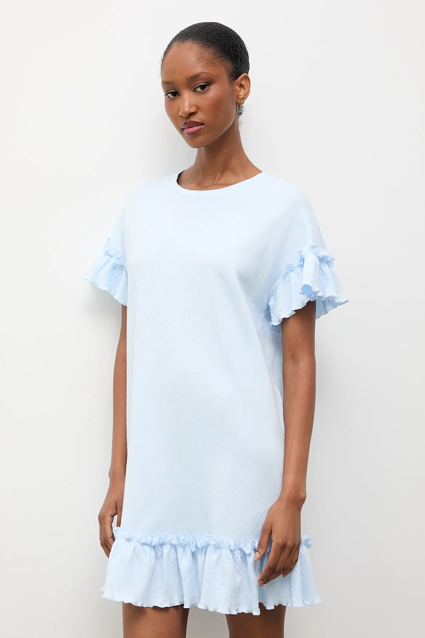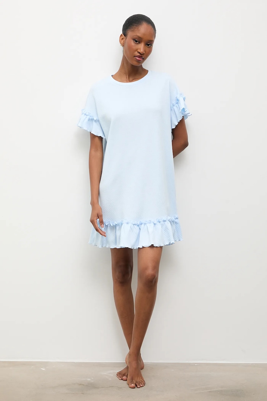 - Luźny krój zapewniający pełną swobodę ruchów. - Klasyczny, okrągły dekolt. - Krój rękawa z obniżoną linią ramion nie ogranicza mobilności. - Efektowne falbany. - Długość: 86 cm. - Szerokość pod pachami: 54 cm. - Wymiary podane dla rozmiaru: S.
