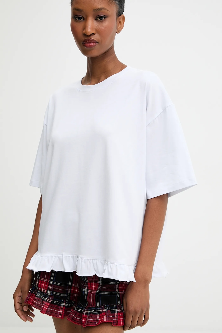 - Luźny krój zapewniający pełną swobodę ruchów. - Okrągły, prążkowany dekolt. - Model z ozdobną falbaną. - Prosty, nie blokujący ruchów fason. - Elastyczna listwa w pasie zapobiega zsuwaniu się podczas ruchu. - Model z koronkową wstawką. - Szerokość w pasie: 34 cm. - Szerokość w biodrach: 52 cm. - Wysokość stanu: 37 cm. - Długość nogawki: 32 cm. - Długość: 62 cm. - Szerokość pod pachami: 62 cm. - Wymiary podane dla rozmiaru: S.