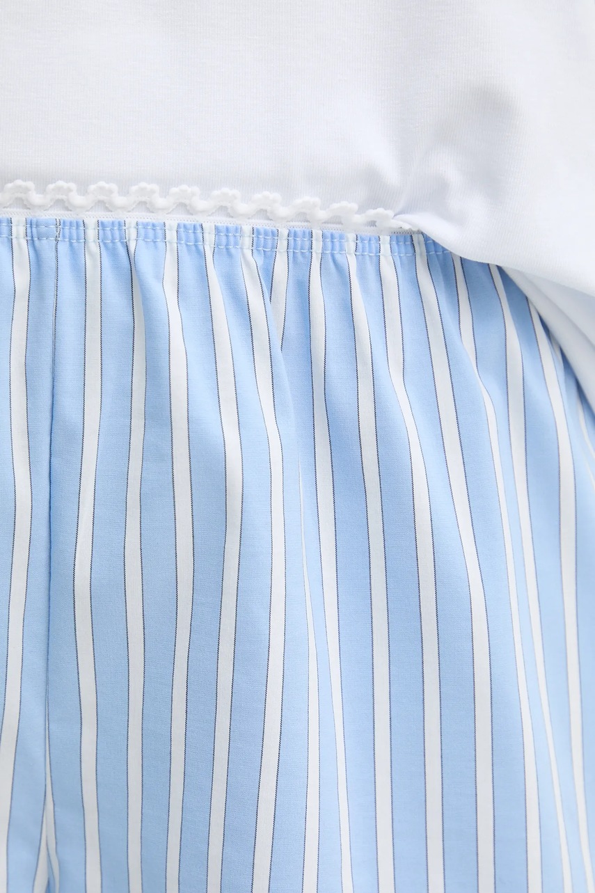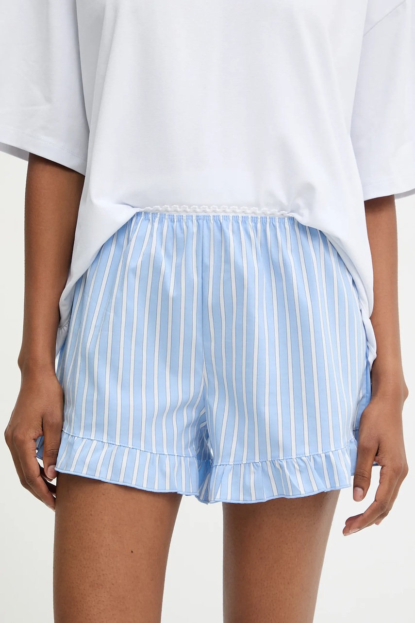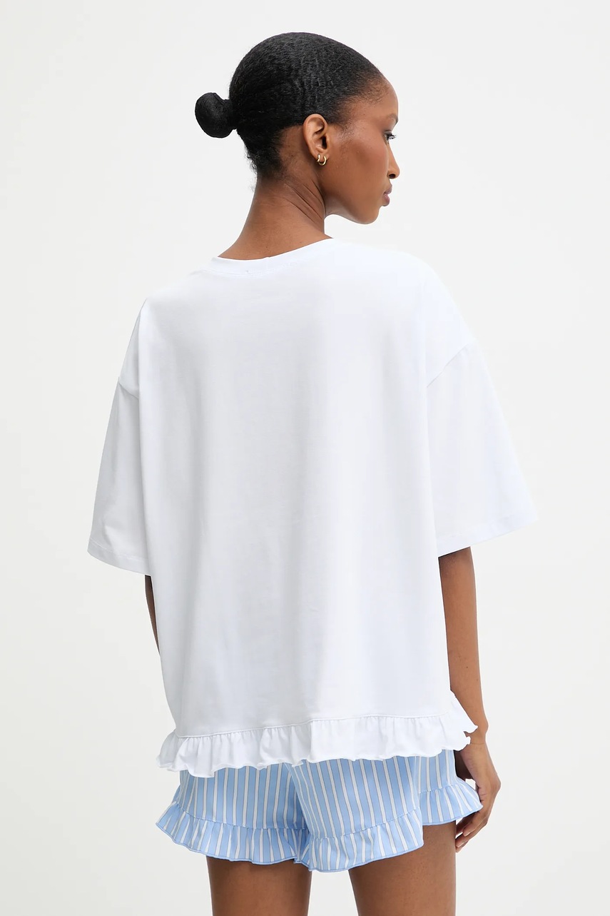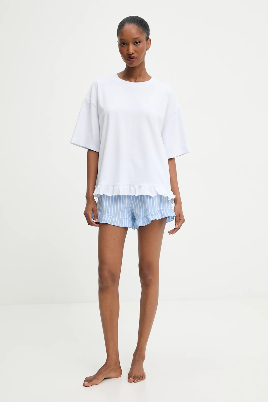 - Luźna góra i prosty dół. - Okrągły, prążkowany dekolt. - Model z ozdobną falbaną. - Koronkowe wstawki. - Krój rękawa z obniżoną linią ramion nie ogranicza mobilności. - Szerokość w pasie: 37 cm. - Długość nogawki: 32 cm. - Długość: 63 cm. - Szerokość pod pachami: 64 cm. - Wymiary podane dla rozmiaru: S.
