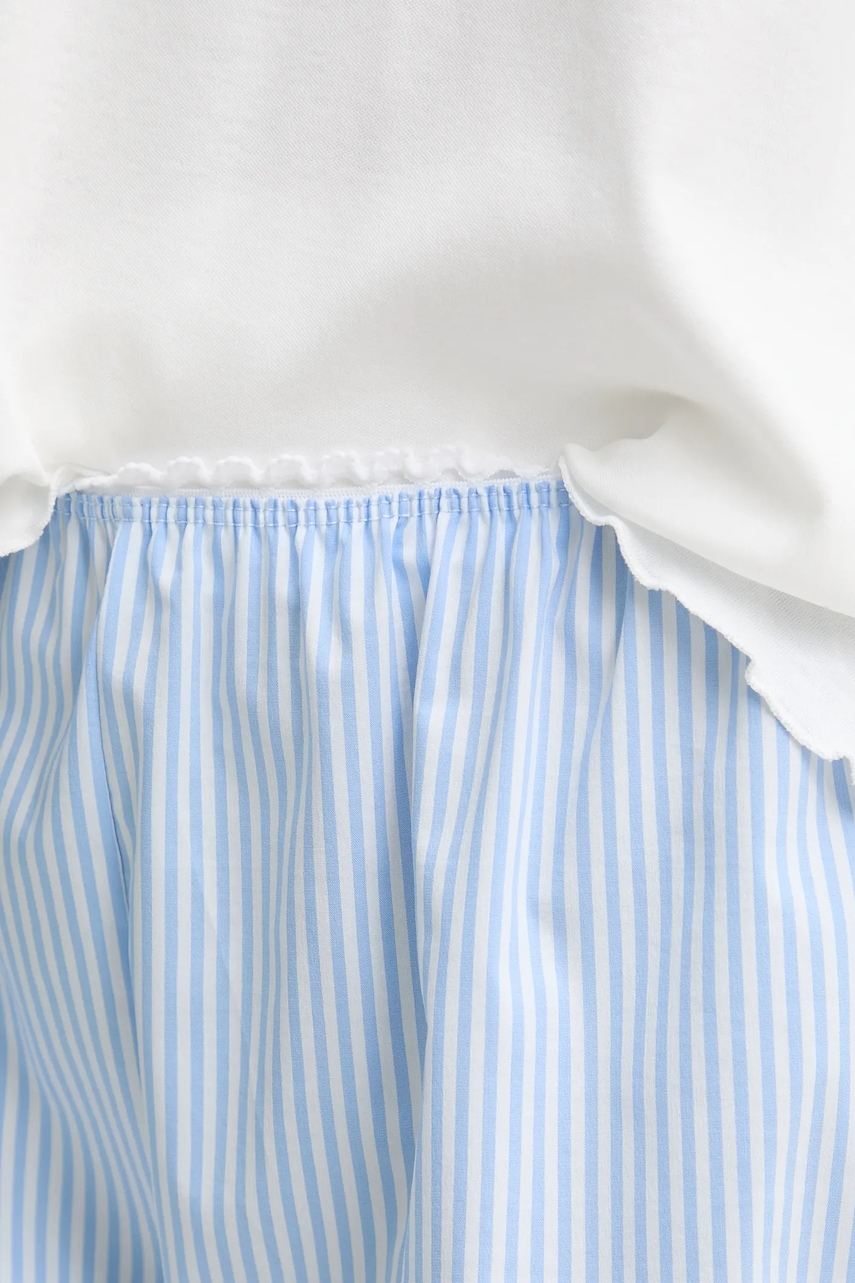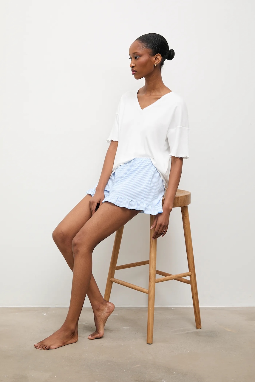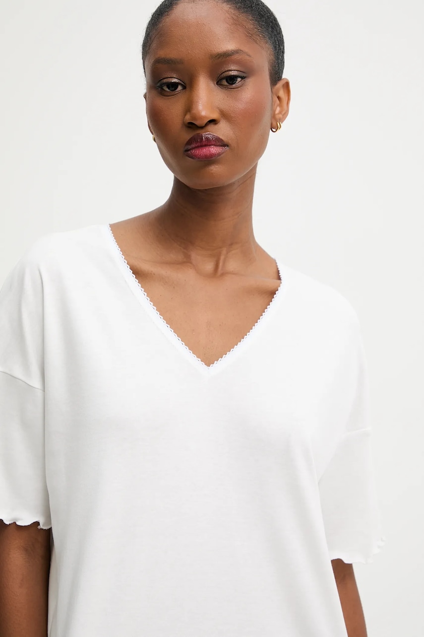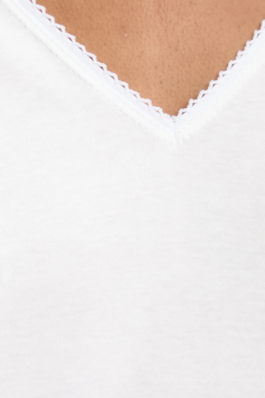 - Prosty, nie blokujący ruchów fason. - Krój rękawa z obniżoną linią ramion nie ogranicza mobilności. - Ozdobny, spiczasty dekolt. - Model z koronkowymi wstawkami. - Model z ozdobną falbaną. - Elastyczna listwa w pasie zapobiega zsuwaniu się podczas ruchu. - Długość: 60 cm. - Szerokość pod pachami: 55 cm. - Szerokość w pasie: 33 cm. - Wysokość stanu: 25 cm. - Długość nogawki: 32 cm. - Wymiary podane dla rozmiaru: S.