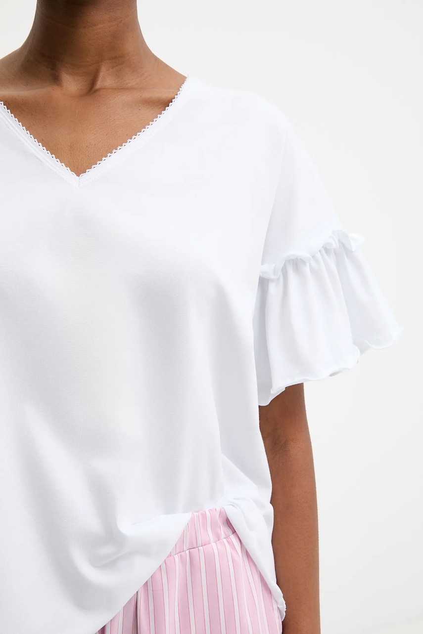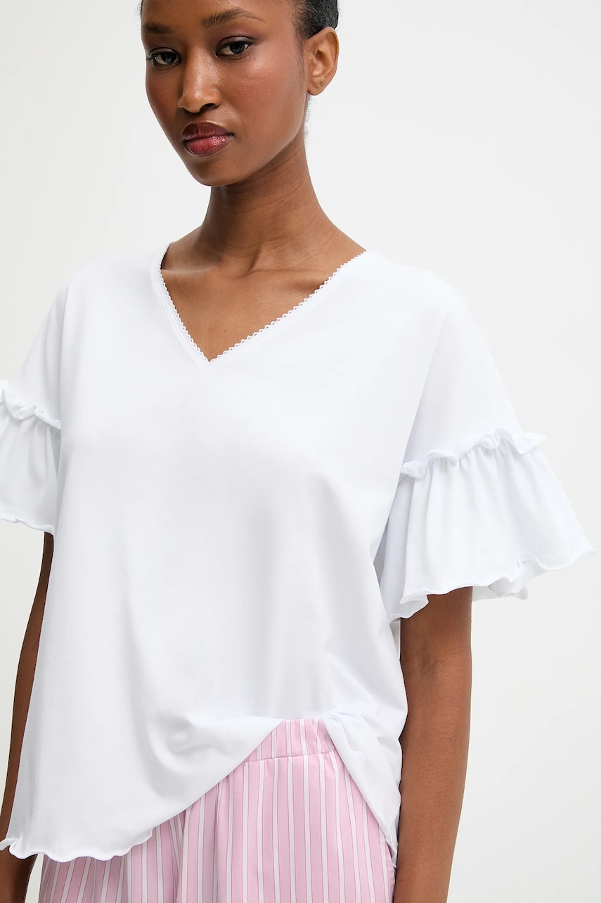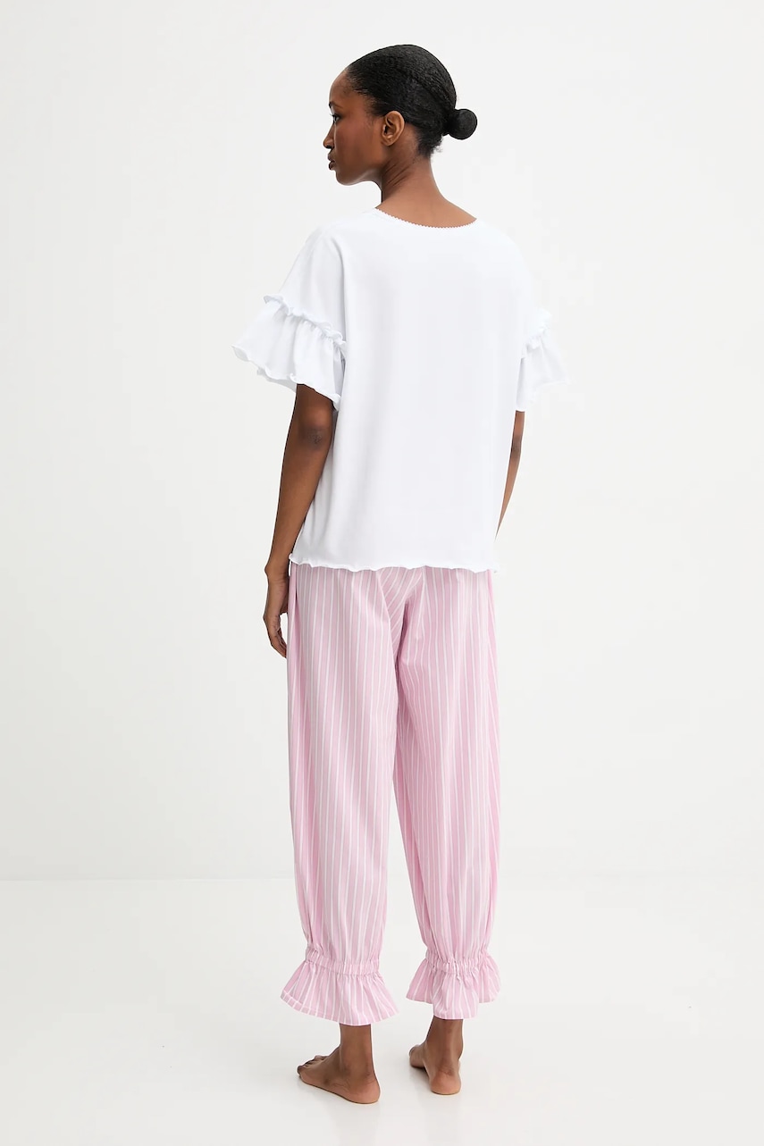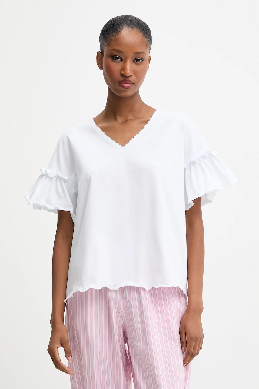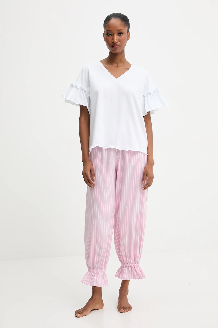 - Luźny krój zapewniający pełną swobodę ruchów. - Spiczasty dekolt. - Elastyczna listwa w pasie. - Dwie wsuwane kieszenie boczne. - Szerokość pod pachami: 55 cm. - Długość: 55 cm. - Szerokość w pasie: 34 cm. - Szerokość w biodrach: 57 cm. - Wysokość stanu: 30 cm. - Szerokość nogawki na dole: 14 cm. - Długość wewnętrzna nogawki: 66 cm. - Wymiary podane dla rozmiaru: S.