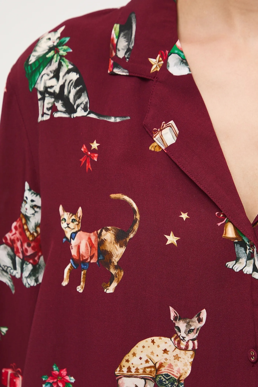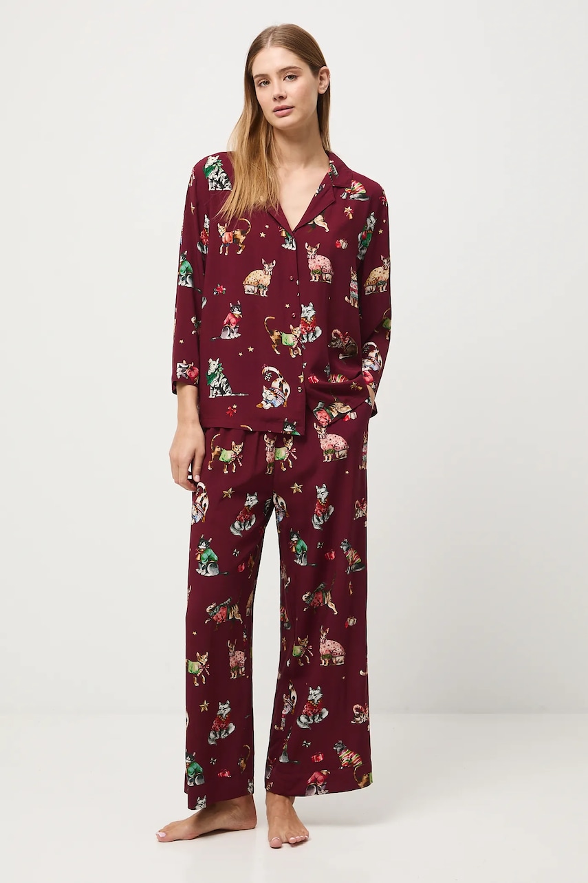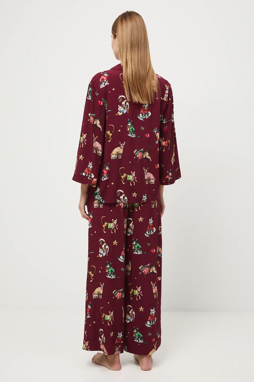 - Luźny fason. - Rękaw trzy czwarte. - Model z kołnierzykiem. - Zapięcie na guziki. - Regularna talia. - Elastyczna listwa w pasie. - Wsuwane kieszenie. - Szeroka nogawka. - Wzorzysta tkanina. - Wzór z motywem zwierzęcym - koty. - Motyw świąteczny. - Rozmieszczenie wzoru może różnić się na każdej sztuce produktu. - Długość: 67 cm. - Szerokość w biuście: 53 cm. - Szerokość w pasie (przed rozciągnięciem): 37,5 cm. - Szerokość w pasie (po rozciągnięciu): 50,5 cm. - Szerokość w biodrach: 55 cm. - Wysokość stanu: 31 cm. - Szerokość nogawki na dole: 31 cm. - Długość wewnętrzna nogawki: 67 cm. - Wymiary podane dla rozmiaru: S. Chcesz zapakować ten produkt na prezent? W koszyku zakupów zaznacz opcję „Zapakuj na prezent”, a my zrobimy to dla Ciebie.