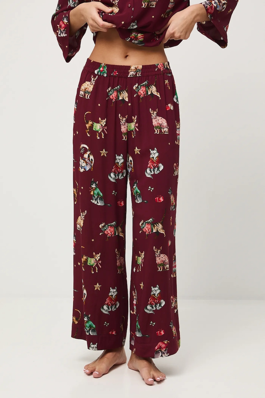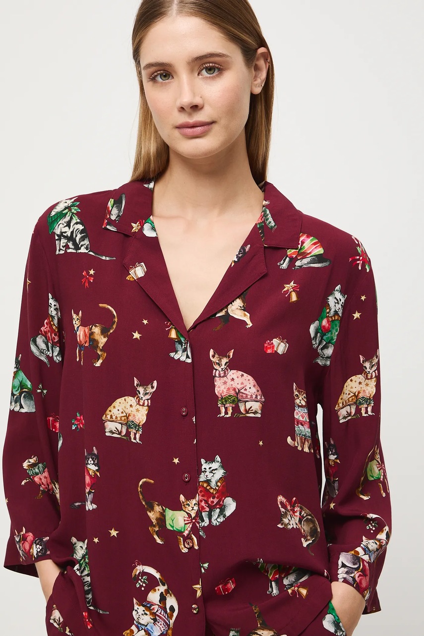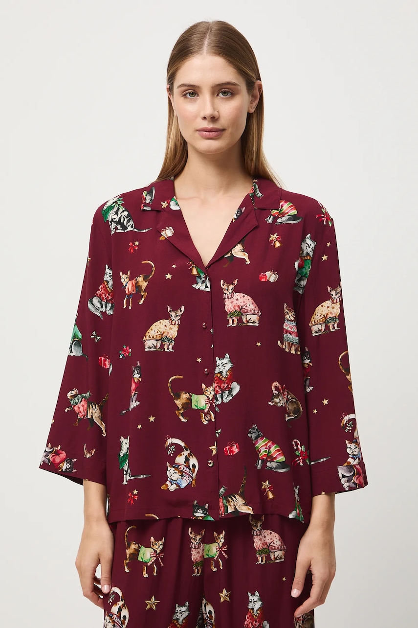- Luźny fason. - Rękaw trzy czwarte. - Model z kołnierzykiem. - Zapięcie na guziki. - Regularna talia. - Elastyczna listwa w pasie. - Wsuwane kieszenie. - Szeroka nogawka. - Wzorzysta tkanina. - Wzór z motywem zwierzęcym - koty. - Motyw świąteczny. - Rozmieszczenie wzoru może różnić się na każdej sztuce produktu. - Długość: 67 cm. - Szerokość w biuście: 53 cm. - Szerokość w pasie (przed rozciągnięciem): 37,5 cm. - Szerokość w pasie (po rozciągnięciu): 50,5 cm. - Szerokość w biodrach: 55 cm. - Wysokość stanu: 31 cm. - Szerokość nogawki na dole: 31 cm. - Długość wewnętrzna nogawki: 67 cm. - Wymiary podane dla rozmiaru: S. Chcesz zapakować ten produkt na prezent? W koszyku zakupów zaznacz opcję „Zapakuj na prezent”, a my zrobimy to dla Ciebie.