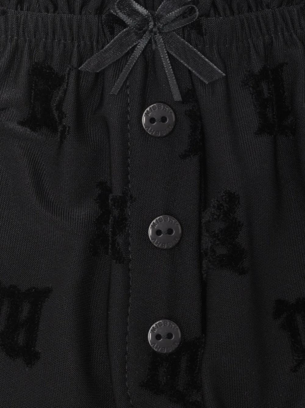 beige velour monogram pattern ribbon detail frills at hem frills at straps embroidered detail