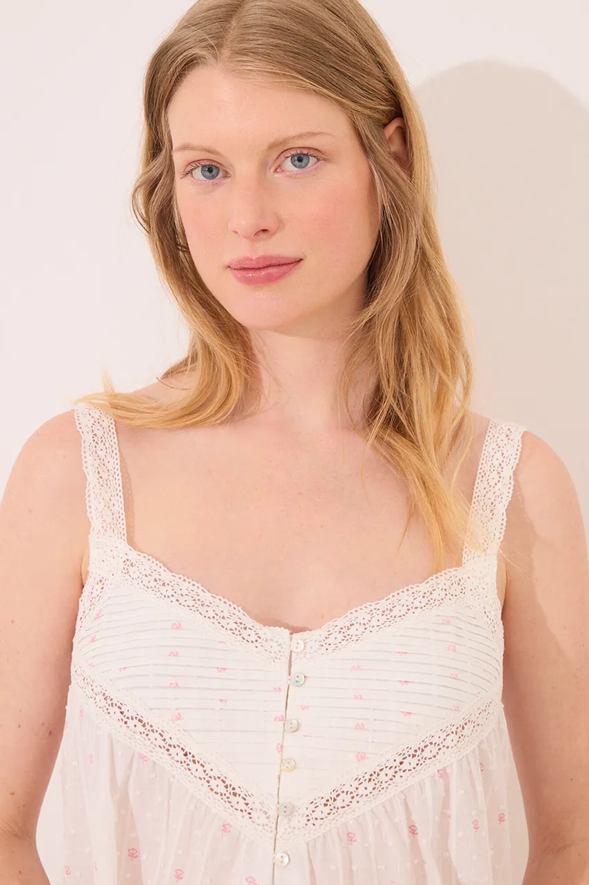 - Better Cotton Initiative. Produkty, oznaczone tym znakiem, zawierają przynajmniej 50% bawełny pochodzącej od sprzedawcy lub marki, należącej do inicjatywy Better Cotton oraz inwestującej w rozwój BCI. - Prosty, nie blokujący ruchów fason. - Ozdobny, spiczasty dekolt. - Nieregulowane, nieodpinane ramiączka. - Koronkowe wstawki. - Krótkie zapięcie na guziki ułatwia sprawną wentylację oraz swobodne ubieranie i ściąganie. - Cienki materiał.