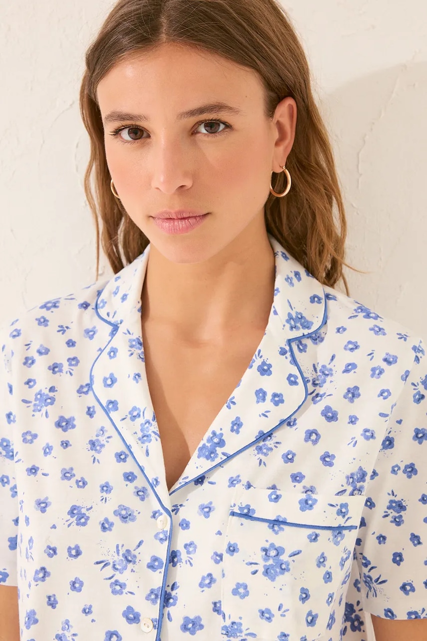 - Better Cotton Initiative. Produkty, oznaczone tym znakiem, zawierają przynajmniej 50% bawełny pochodzącej od sprzedawcy lub marki, należącej do inicjatywy Better Cotton oraz inwestującej w rozwój BCI. - Prosty, nie blokujący ruchów fason. - W skład piżamy wchodzi koszula i spodnie. - Krótki rękaw. - Model z kołnierzykiem. - Wygodne zapięcie na guziki ułatwia zakładanie i zdejmowanie. - Wsuwana kieszonka na piersi.