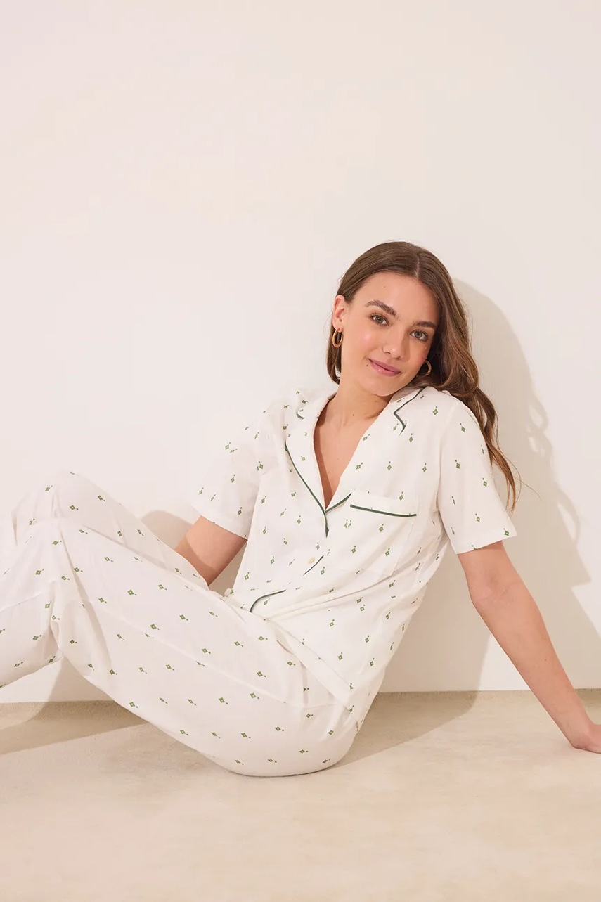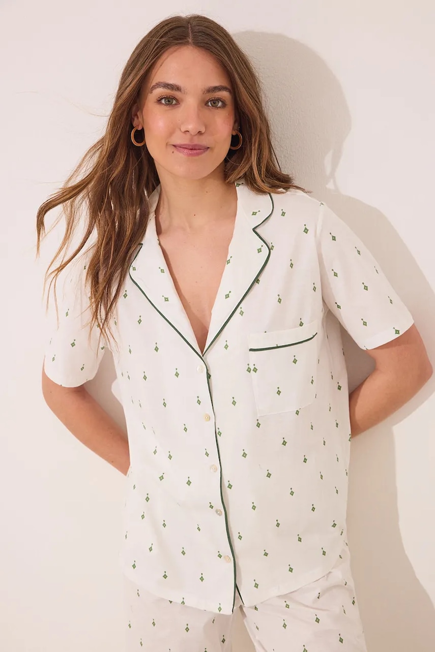- Better Cotton Initiative. Produkty, oznaczone tym znakiem, zawierają przynajmniej 50% bawełny pochodzącej od sprzedawcy lub marki, należącej do inicjatywy Better Cotton oraz inwestującej w rozwój BCI. - Prosty, nie blokujący ruchów fason. - W skład piżamy wchodzi koszula i spodnie. - Model z kołnierzykiem. - Zapięcie na guziki. - Krótki rękaw. - Wsuwana kieszonka na piersi. - Elastyczna listwa w pasie.