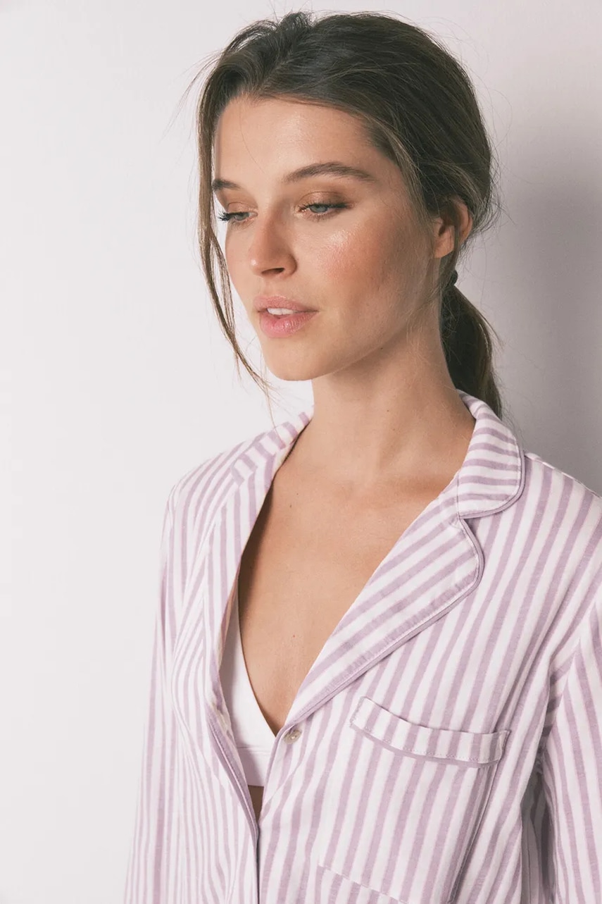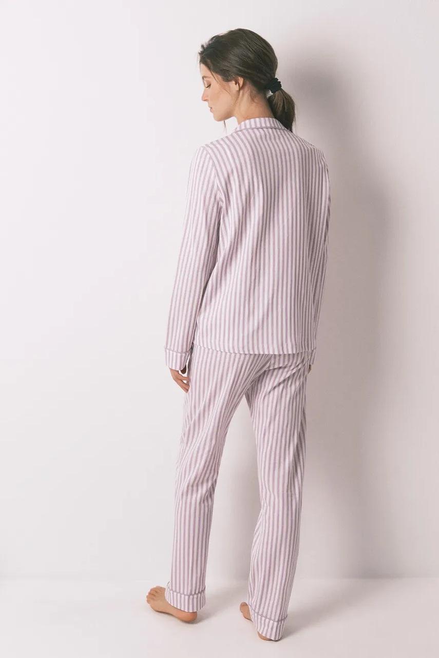 - W skład piżamy wchodzi koszula i spodnie. - Długi rękaw. - Model z miękkim kołnierzykiem. - Zapięcie na guziki. - Kieszonki na piersi. - Prosta nogawka na całej długości. - W pasie elastyczna listwa z troczkami. - Model wykończony ozdobną lamówką.