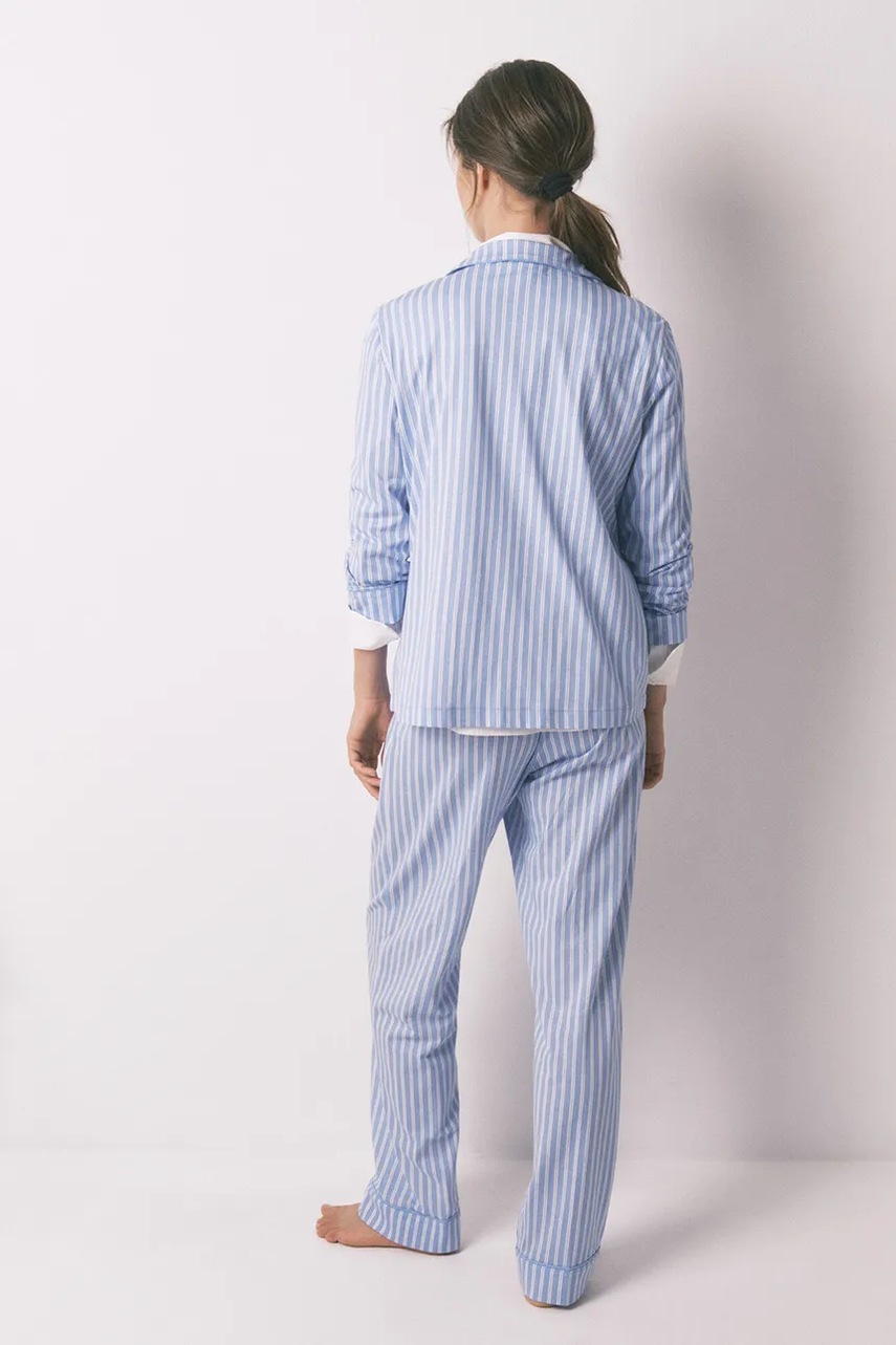 - W skład piżamy wchodzi koszula i spodnie. - Prosty fason. - Model z kołnierzykiem. - W pasie wąska, elastyczna listwa. - Zapięcie na guziki. - Długi, rozszerzany rękaw.
