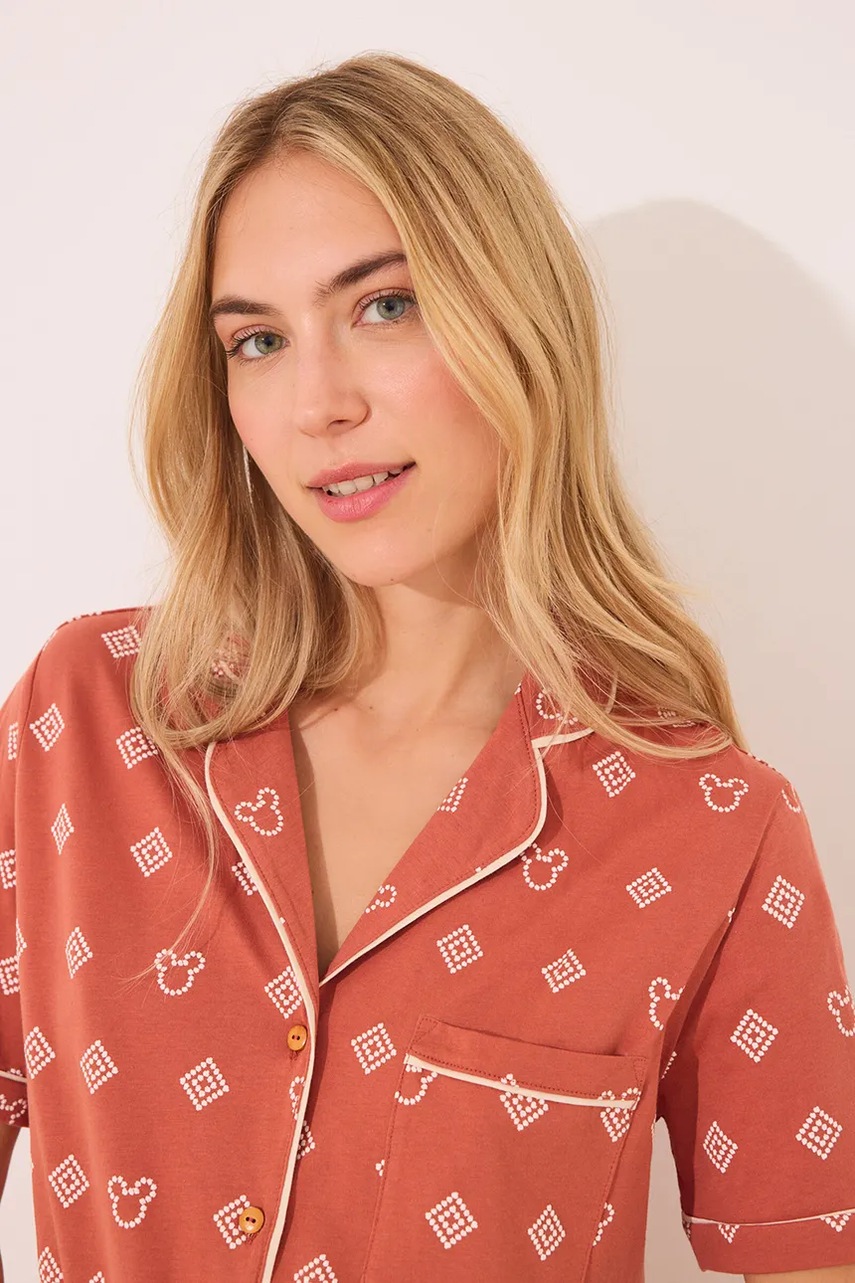 - Better Cotton Initiative. Produkty, oznaczone tym znakiem, zawierają przynajmniej 50% bawełny pochodzącej od sprzedawcy lub marki, należącej do inicjatywy Better Cotton oraz inwestującej w rozwój BCI. - W skład piżamy wchodzi koszula i spodnie. - Prosty, nie blokujący ruchów fason. - Model z kołnierzykiem. - Wygodne zapięcie na guziki ułatwia zakładanie i zdejmowanie. - Krótki rękaw. - Wsuwana kieszonka na piersi. - W pasie elastyczna listwa z troczkami. - Wzorzysta dzianina.