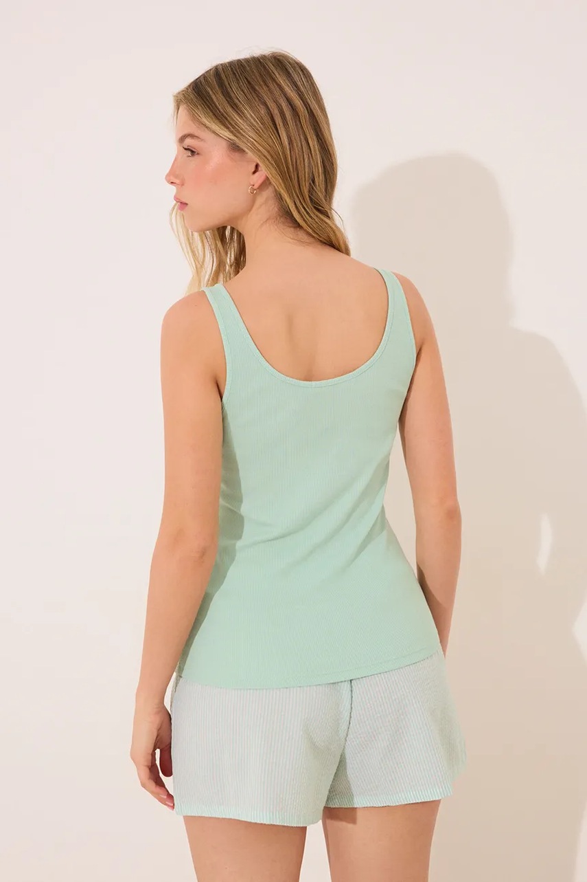 - Better Cotton Initiative. Produkty, oznaczone tym znakiem, zawierają przynajmniej 50% bawełny pochodzącej od sprzedawcy lub marki, należącej do inicjatywy Better Cotton oraz inwestującej w rozwój BCI. - Prosty, nie blokujący ruchów fason. - W skład piżamy wchodzi top i szorty. - Klasyczny, okrągły dekolt. - Nieregulowane, nieodpinane ramiączka. - Elastyczna listwa w pasie.