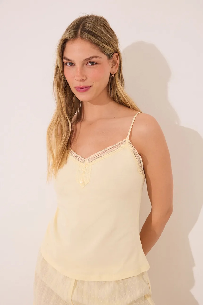 - Better Cotton Initiative. Produkty, oznaczone tym znakiem, zawierają przynajmniej 50% bawełny pochodzącej od sprzedawcy lub marki, należącej do inicjatywy Better Cotton oraz inwestującej w rozwój BCI. - Prosty, nie blokujący ruchów fason. - W skład piżamy wchodzi top i szorty. - Regulowane ramiączka umożliwiają indywidualne dopasowanie. - Ozdobny, spiczasty dekolt. - Elastyczna listwa w pasie. - Cienki materiał.