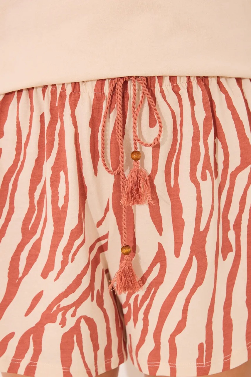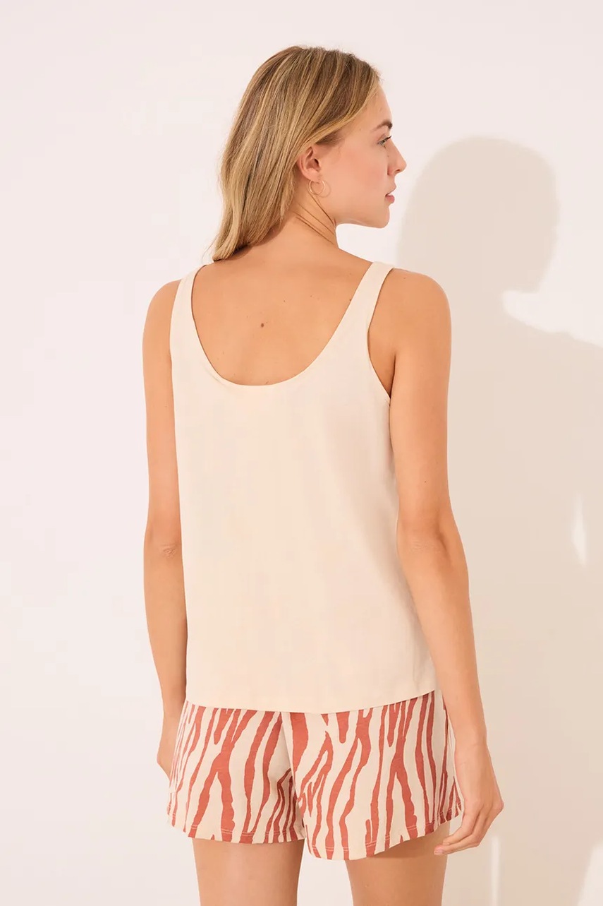 - Better Cotton Initiative. Produkty, oznaczone tym znakiem, zawierają przynajmniej 50% bawełny pochodzącej od sprzedawcy lub marki, należącej do inicjatywy Better Cotton oraz inwestującej w rozwój BCI. - Prosty, nie blokujący ruchów fason. - W skład piżamy wchodzi top i szorty. - Spiczasty dekolt. - Model na ramiączkach. - W pasie elastyczna listwa z troczkami. - Cienka, elastyczna dzianina.