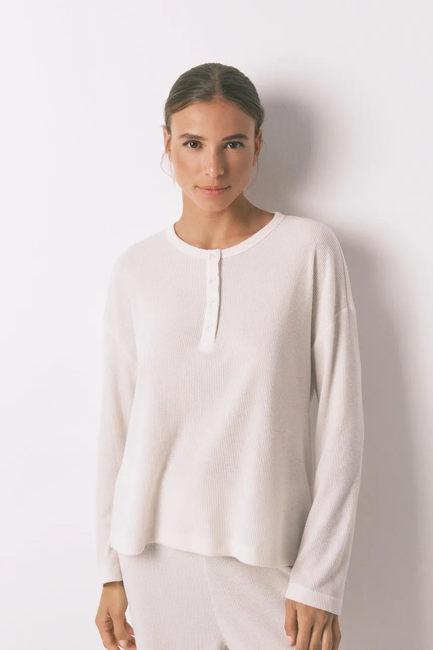 - Luźny krój zapewniający pełną swobodę ruchów. - Krój rękawa z obniżoną linią ramion nie ogranicza mobilności. - Krótkie zapięcie na guziki. - W pasie elastyczna listwa z troczkami. - Cienka, lekko elastyczna dzianina.