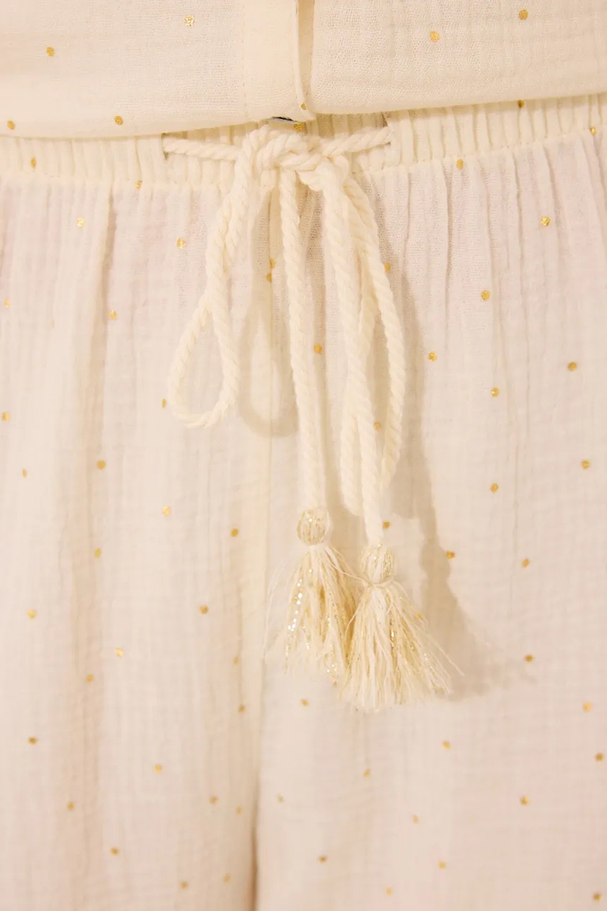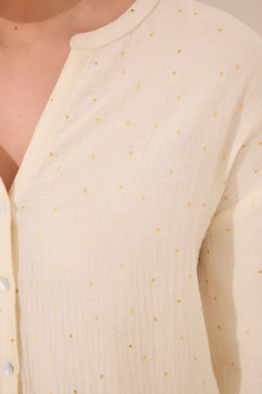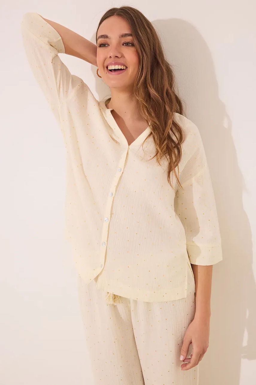 - W skład piżamy wchodzi koszula i spodnie. - Luźny krój zapewniający pełną swobodę ruchów. - Rękaw trzy czwarte. - Krój rękawa z obniżoną linią ramion nie ogranicza mobilności. - Wygodne zapięcie na guziki ułatwia zakładanie i zdejmowanie. - Spodnie luźne w okolicy bioder i ud. - Wysoki stan zapewnia komfort podczas aktywności i pozwala optycznie wyszczuplić sylwetkę. - Elastyczna listwa w pasie zapobiega zsuwaniu się podczas ruchu. - W pasie troczki. - Prosta nogawka na całej długości.
