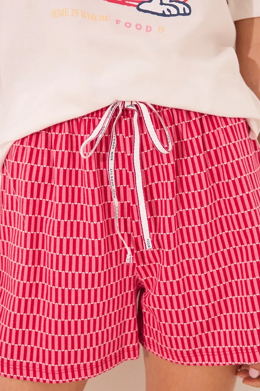 - Better Cotton Initiative. Produkty, oznaczone tym znakiem, zawierają przynajmniej 50% bawełny pochodzącej od sprzedawcy lub marki, należącej do inicjatywy Better Cotton oraz inwestującej w rozwój BCI. - W skład piżamy wchodzi t-shirt i szorty. - Prosty, nie blokujący ruchów fason. - Klasyczny, okrągły dekolt. - Krótki rękaw. - W pasie elastyczna listwa z troczkami.