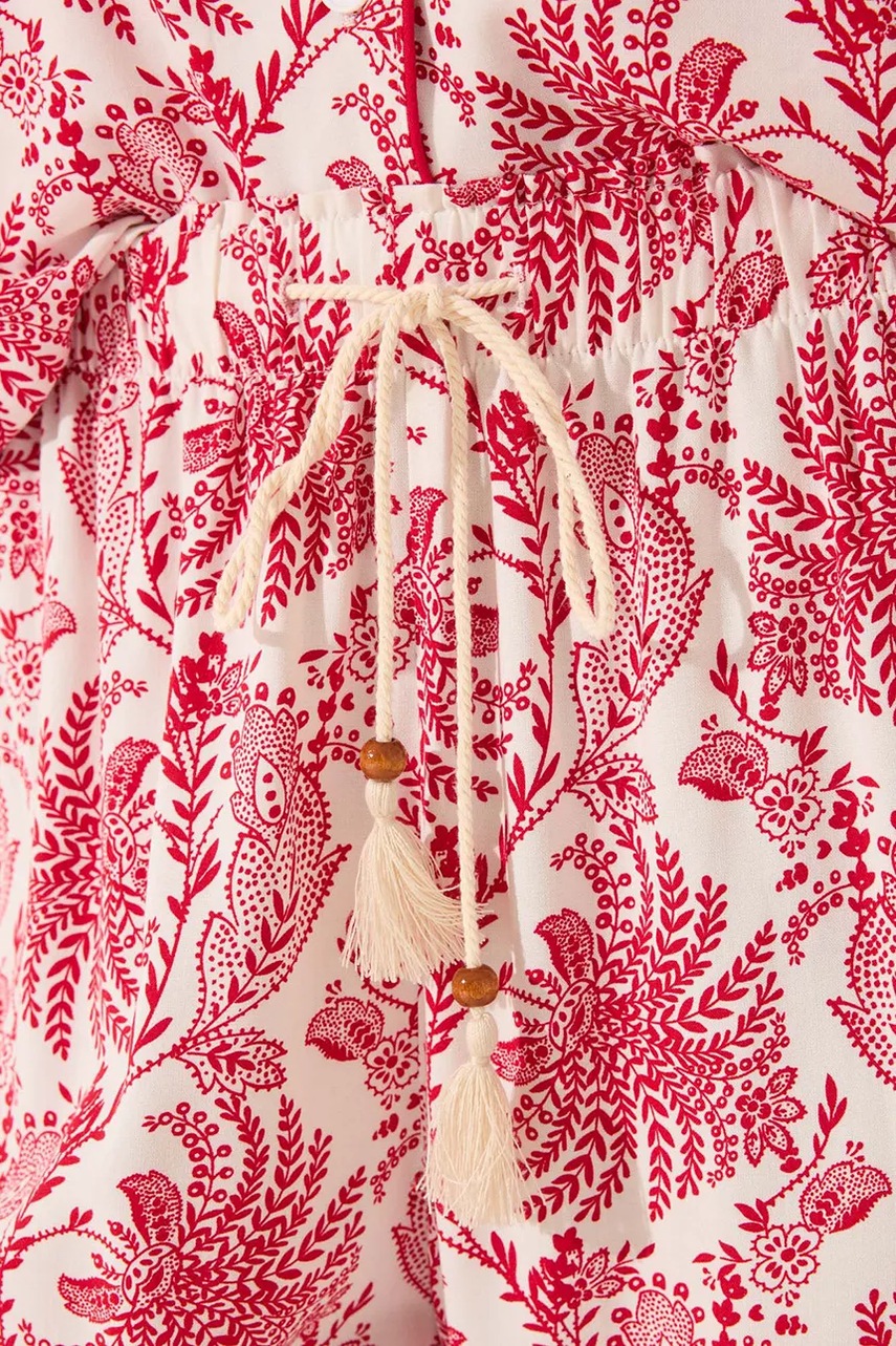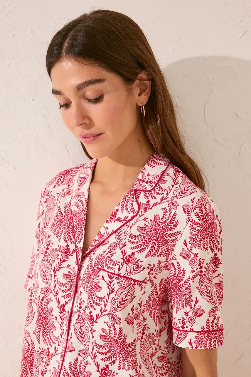 - Prosty, nie blokujący ruchów fason. - W skład piżamy wchodzi koszula i spodnie. - Wygodne zapięcie na guziki ułatwia zakładanie i zdejmowanie. - Model z kołnierzykiem. - Krótki rękaw. - Wsuwana kieszonka na piersi. - W pasie elastyczna listwa z troczkami. - Cienki materiał.