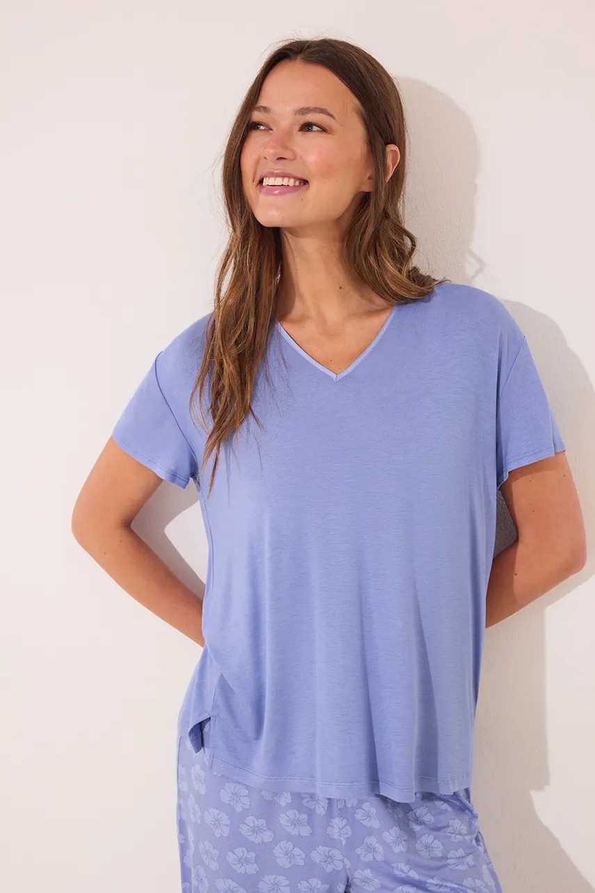 - Produkt częściowo wykonany z LENZING™ ECOVERO™ - materiału przyjaznego środowisku. Produkcja LENZING™ ECOVERO™ z ekologicznej celulozy i pulpy drzewnej wykorzystuje o 50% mniej wody w porównaniu do popularnej wiskozy. - Prosty, nie blokujący ruchów fason. - W skład piżamy wchodzi t-shirt i spodnie. - Krótki rękaw. - W pasie elastyczna listwa z troczkami. - Krój rękawa z obniżoną linią ramion nie ogranicza mobilności.