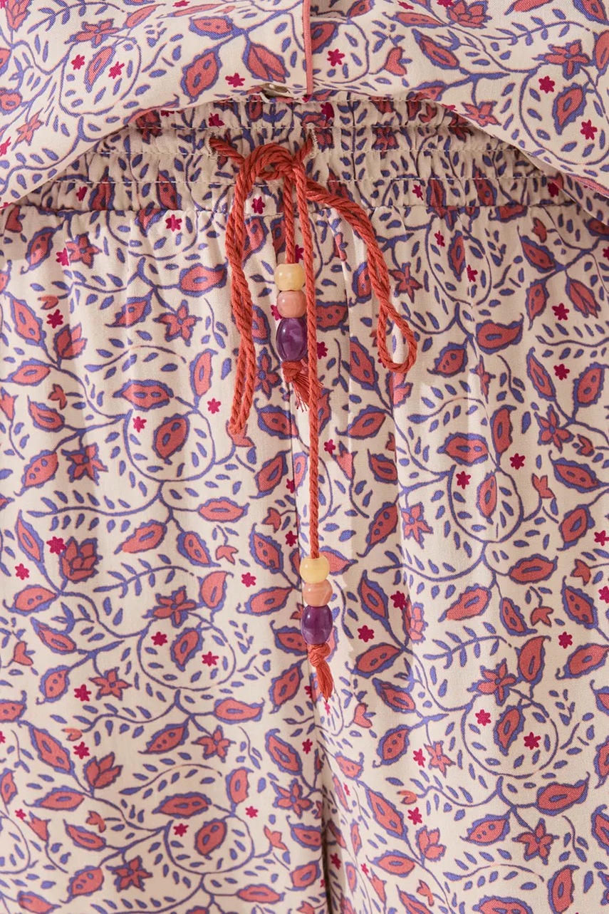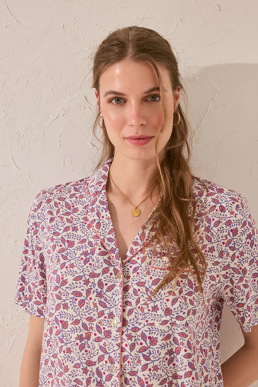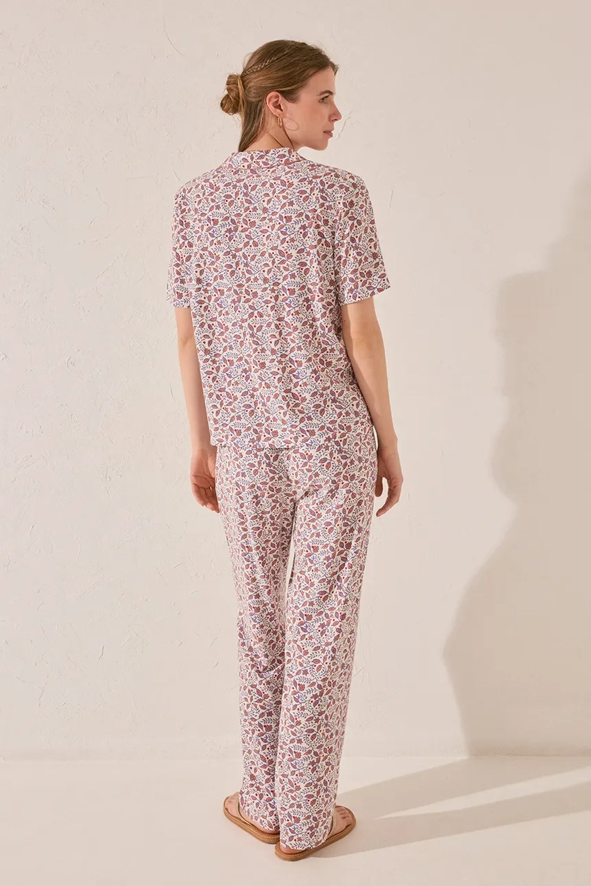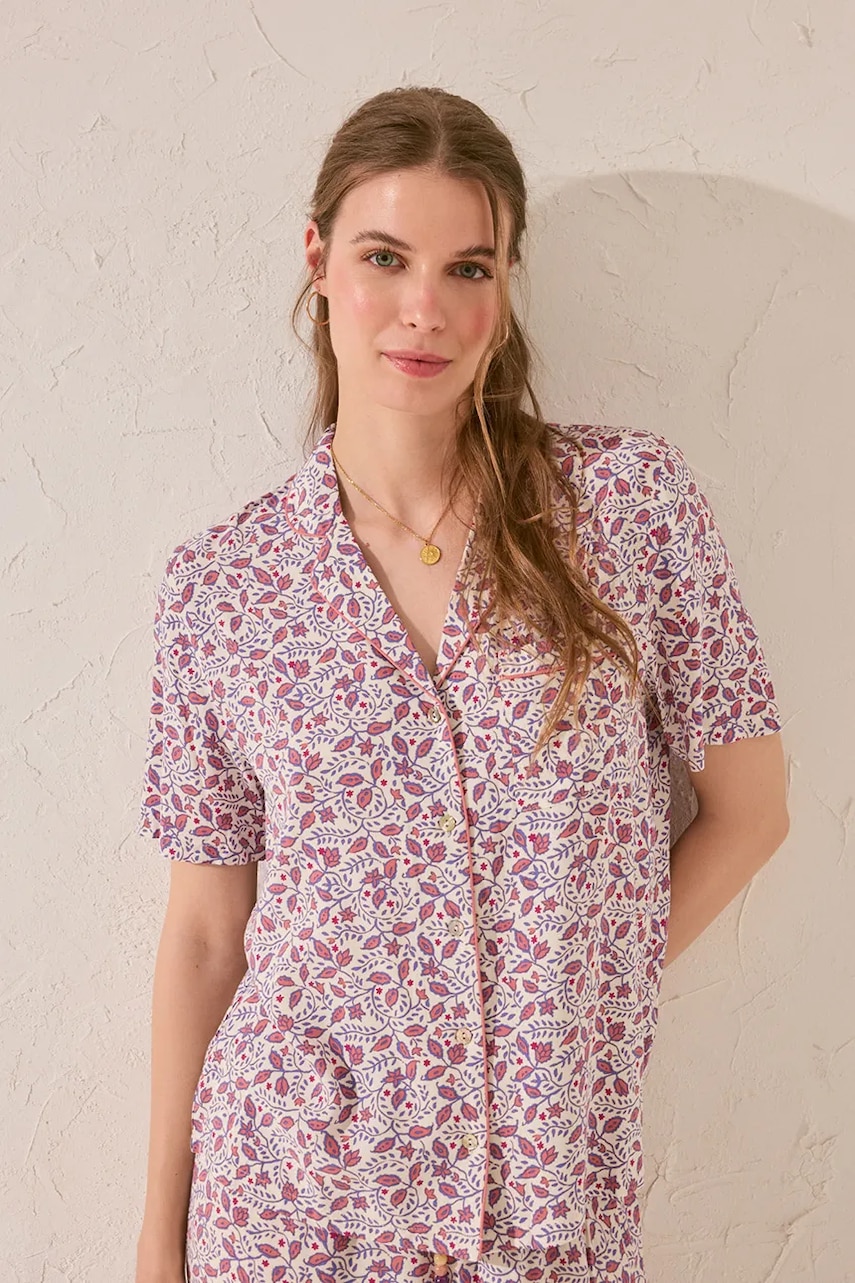 - Prosty, nie blokujący ruchów fason. - W skład piżamy wchodzi koszula i spodnie. - Zapięcie na guziki. - Model z kołnierzykiem. - Krótki rękaw. - W pasie elastyczna listwa z troczkami. - Wzorzysta tkanina.