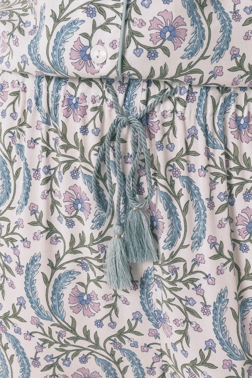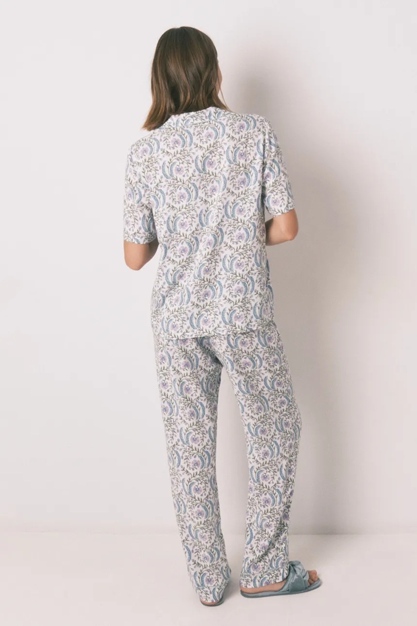 - Produkt Forest-Friendly. Zawiera 50% włókien LENZING™ ECOVERO™, pozyskiwanych z surowców pochodzących z certyfikowanych lasów. - Krótki rękaw. - W skład piżamy wchodzi koszula i spodnie. - Model z miękkim kołnierzykiem. - Zapięcie na guziki. - Model wykończony ozdobną lamówką.