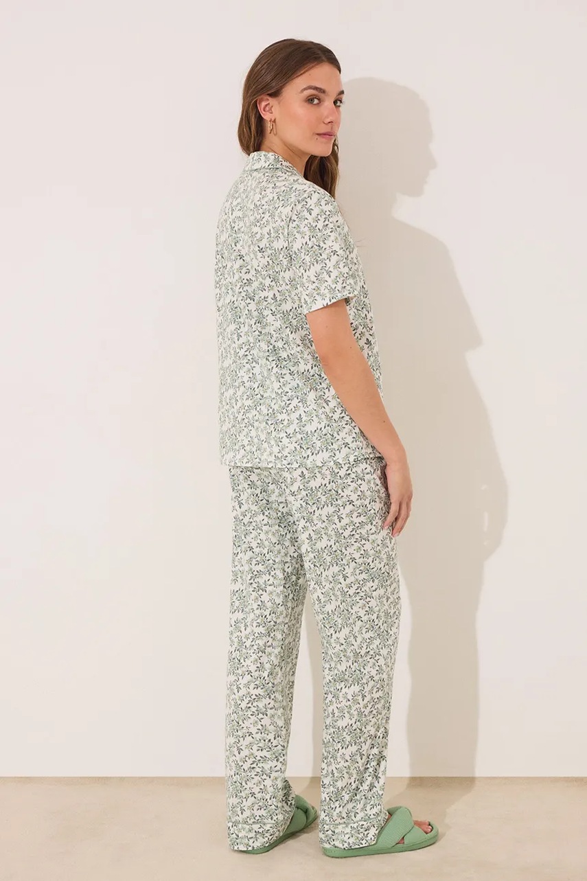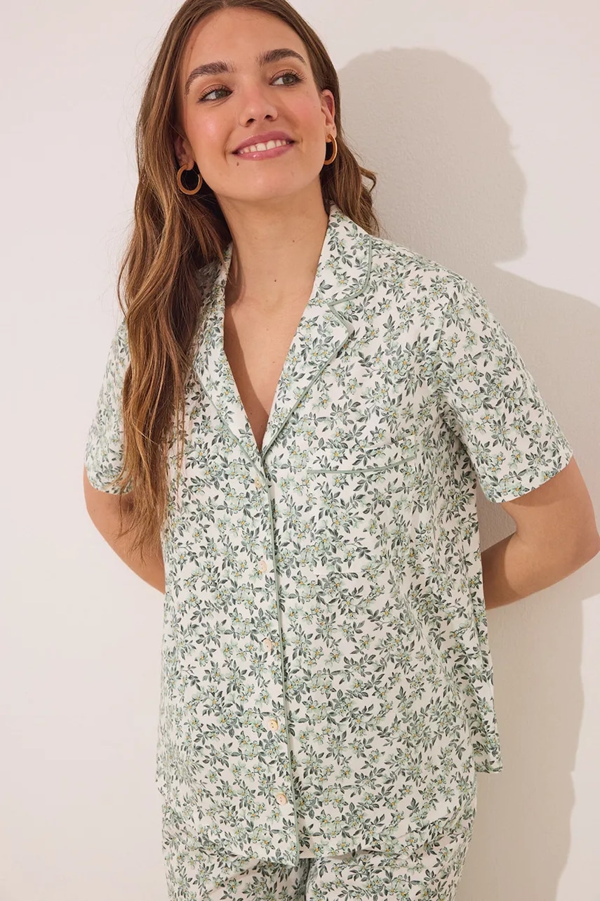 - W skład piżamy wchodzi koszula i spodnie. - Zapięcie na guziki. - Krótki rękaw. - Elastyczna listwa w pasie. - Kieszonka na piersi.