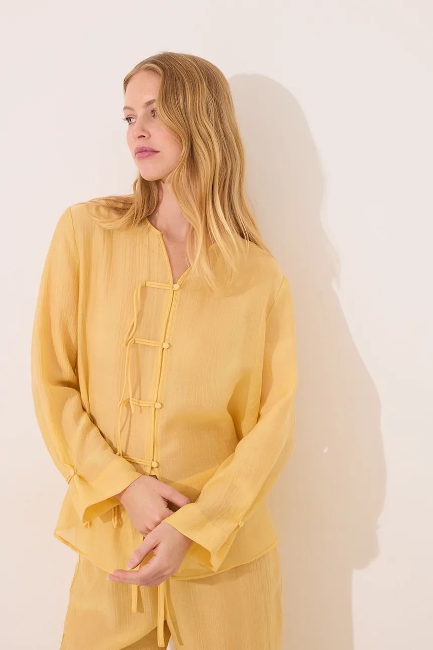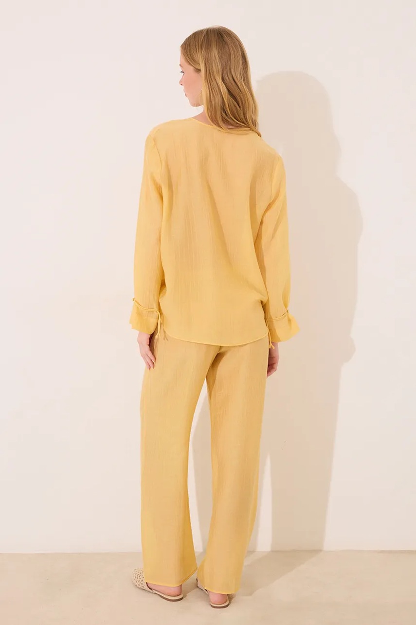 - Prosty, nie blokujący ruchów fason. - W skład piżamy wchodzi koszula i spodnie. - Długi rękaw. - Wygodne zapięcie na guziki ułatwia zakładanie i zdejmowanie. - W pasie elastyczna listwa z troczkami. - Cienki materiał.