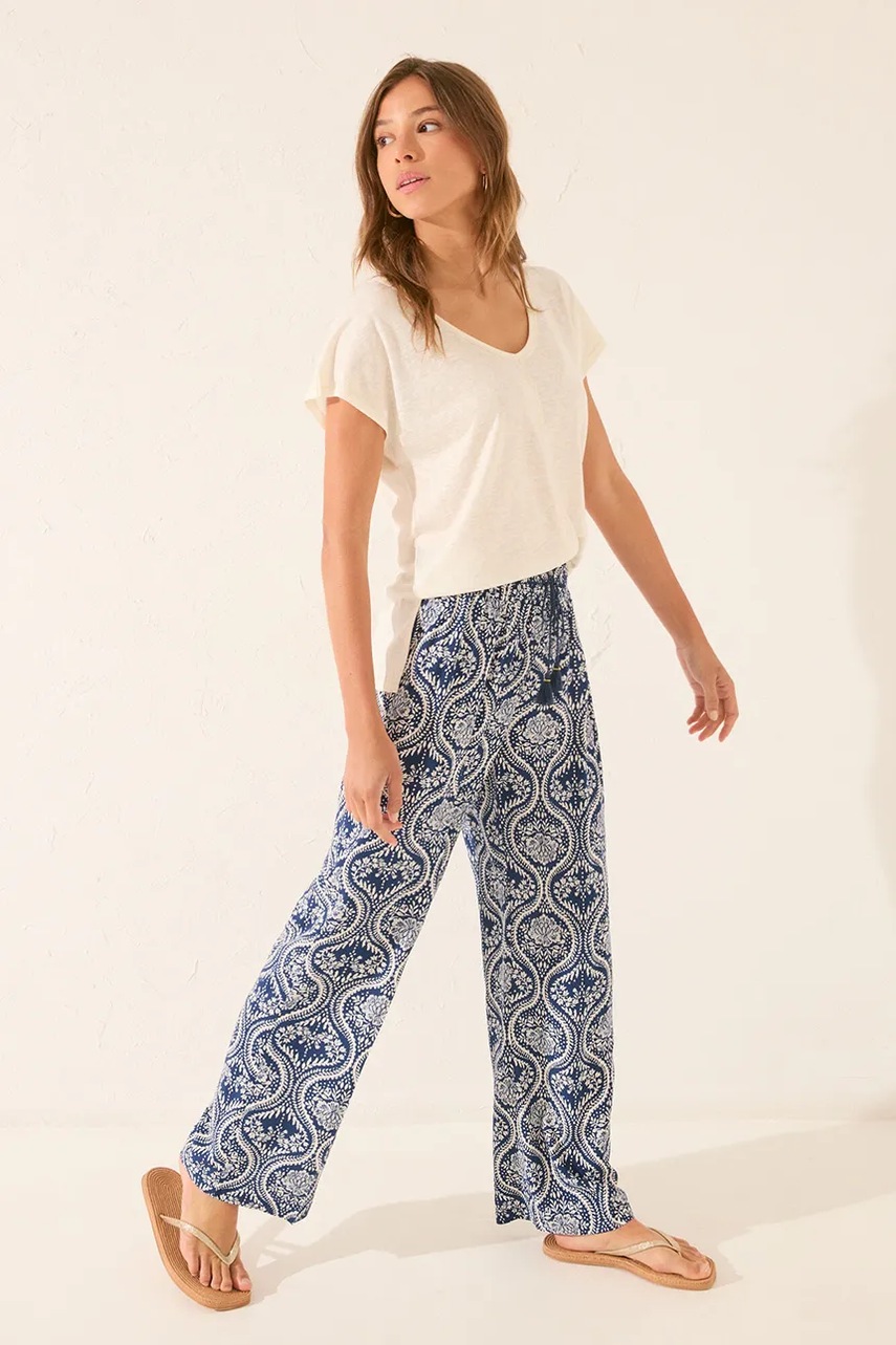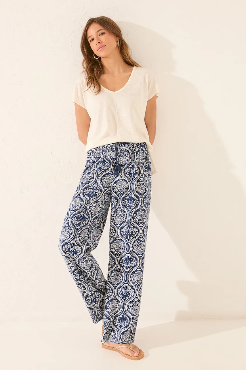 - Prosty, nie blokujący ruchów fason. - Elastyczna listwa w pasie. - W pasie troczki. - Wzorzysta tkanina.