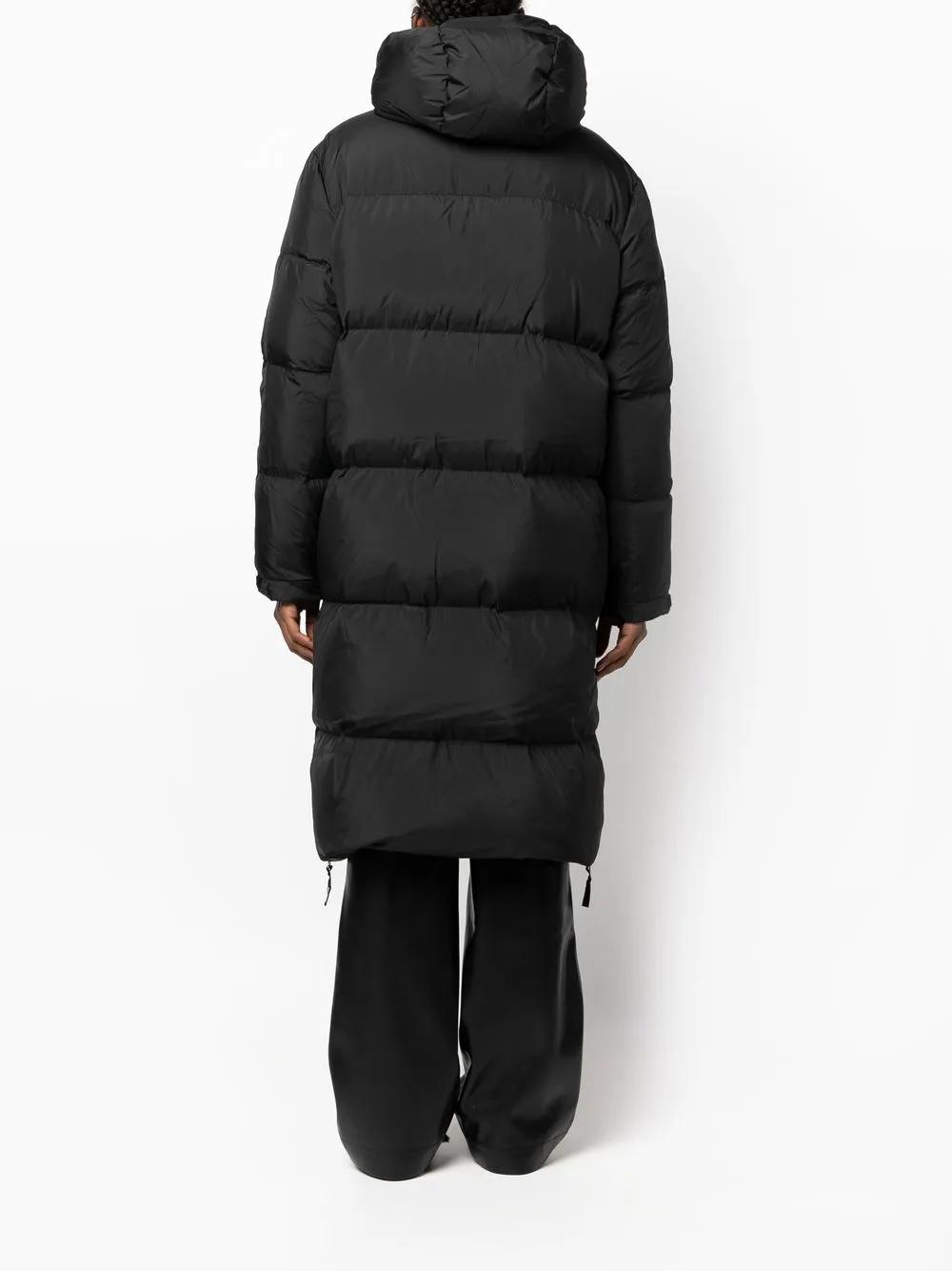 black feather down recycled polyester drawstring hood high neck front zip fastening two side zip-fastening pockets long sleeves straight hem