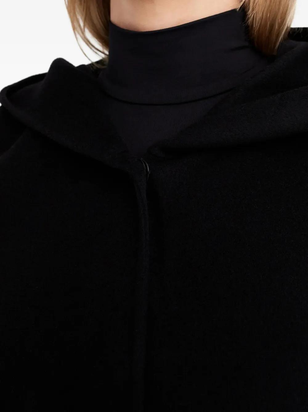 black double-breasted button fastening detachable and adjustable waist belt two side welt pockets long raglan sleeves